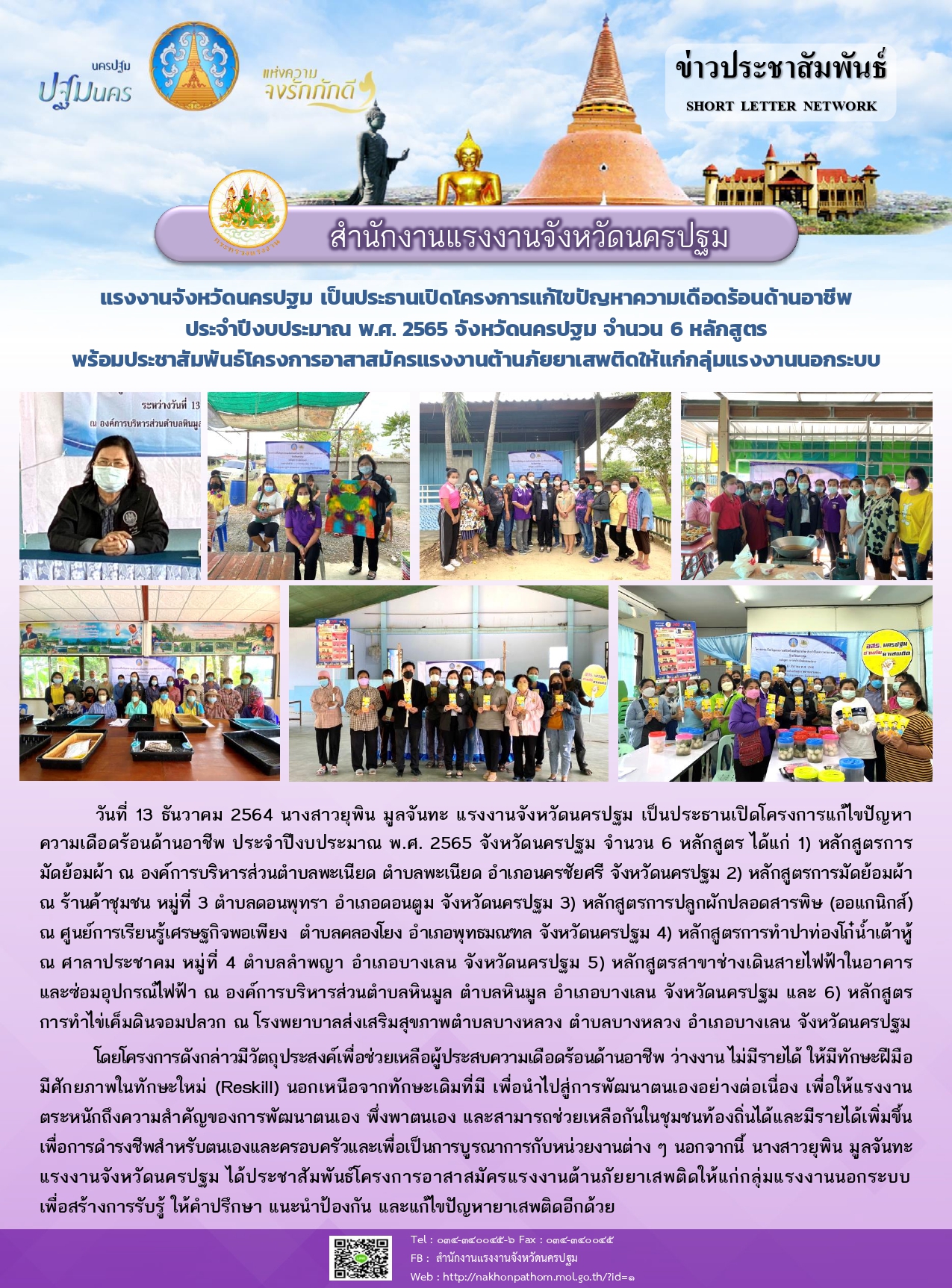 แรงงานจังหวัดนครปฐม เป็นประธานเปิดโครงการแก้ไขปัญหาความเดือดร้อนด้านอาชีพ ประจำปีงบประมาณ พ.ศ. 2565 จังหวัดนครปฐม จำนวน 6 หลักสูตร พร้อมประชาสัมพันธ์โครงการอาสาสมัครแรงงานต้านภัยยาเสพติดให้แก่กลุ่มแรงงานนอกระบบ