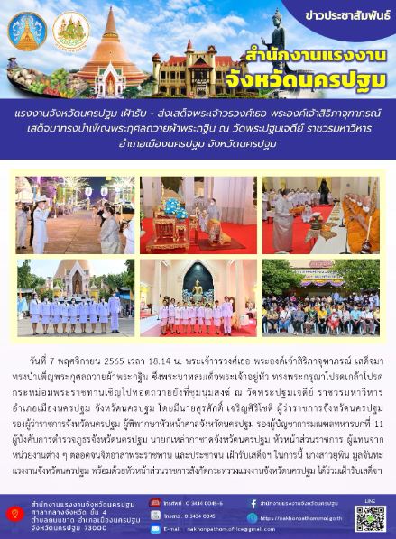 แรงงานจังหวัดนครปฐม เฝ้ารับ – ส่งเสด็จพระเจ้าวรวงศ์เธอ พระองค์เจ้าสิริภาจุฑาภรณ์ เสด็จมาทรงบำเพ็ญพระกุศลถวายผ้าพระกฐิน ณ วัดพระปฐมเจดีย์ ราชวรมหาวิหาร อำเภอเมืองนครปฐม จังหวัดนครปฐม