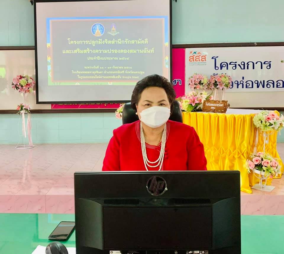 วันที่ 16 กันยายน 2560 เวลา 13.00 – 16.00 น. ดร.วรรณกานต์ ขาวลาภ แรงงานจังหวัดนครปฐม ได้รับเชิญจากนายเชาวเนตร ยิ้มประเสริฐ ท่านปลัดจังหวัดนครปฐม ให้ไปเป็นวิทยากรบรรยายในหัวข้อ “อาชีพในฝันไม่ไกลเกินเอื้อม” ด้วยวิธีการถ่ายทอดองค์ความรู้ ถอดบทเรียนจากประสบการณ์ชีวิตที่ผ่านมาให้แก่เด็กนักเรียน ม.1-6 ของโรงเรียนพลอยจาตุรจินดา ตำบลท่าพระยาอำเภอนครชัยศรี จังหวัดนครปฐม ตามโครงการปลูกฝังจิตสำนึกรักสามัคคีและเสริมสร้างความปรองดองสมานฉันท์ ประจําปี 2564 ณ โรงเรียนพลอยจาตุรจินดาตำบลท่าพระยาอำเภอนครชัยศรีจังหวัดนครปฐม ซึ่งโครงการนี้กระทรวงมหาดไทย ได้มอบหมายให้จังหวัดนครปฐม ดำเนินการจัดทำโครงการฯ ดังกล่าว โดยมีวัตถุประสงค์เพื่อสร้างภูมิคุ้มกันให้แก่เด็กและเยาวชนให้เป็นกลุ่มต้นแบบในการสร้างความรักความสามัคคีของคนในชาติ ซึ่งได้ดำเนินโครงการให้ผู้เข้าร่วมโครงการได้แก่เด็ก ครู มีโอกาสพบปะพูดคุยแลกเปลี่ยนประสบการณ์อย่างสร้างสรรค์พร้อมทั้งร่วมกลุ่ม สรุปแนวทางที่เป็นประโยชน์ต่อการสร้างสรรค์สังคมไทย ให้เกิดความปรองดอง โดยการจัดกิจกรรมลักษณะที่มีมาตราการเว้นระยะห่างทางสังคม ให้มีการประยุกต์ใช้เทคโนโลยีให้เกิดประโยชน์ ในการสื่อสารด้วยการประชุมทางไกลด้วยการเรียนรู้ผ่านระบบ ZOOM MEETTING เป็นการเรียนการสอนรูปแบบออนไลน์ พร้อมทั้งปฏิบัติตามมาตรการ D M H T T A โดยเคร่งครัด