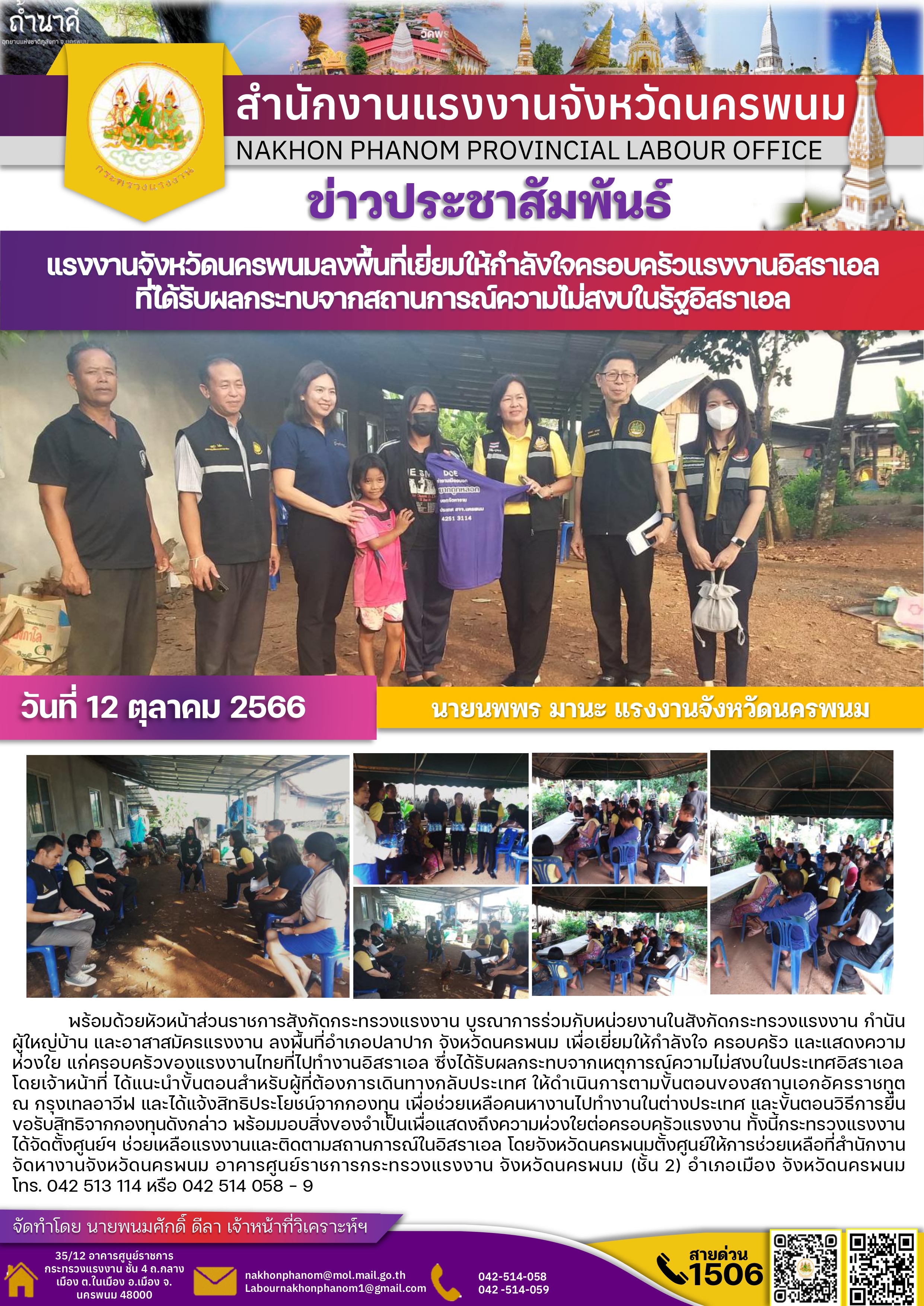 นายนพพร มานะ แรงงานจังหวัดนครพนม พร้อมด้วยหัวหน้าส่วนราชการสังกัดกระทรวงแรงงาน บูรณาการร่วมกับหน่วยงานในสังกัดกระทรวงแรงงาน กำนัน ผู้ใหญ่บ้าน และอาสาสมัครแรงงาน ลงพื้นที่อำเภอปลาปาก จังหวัดนครพนม เพื่อเยี่ยมให้กำลังใจ ครอบครัว และแสดงความห่วงใย แก่ครอบครัวของแรงงานไทยที่ไปทำงานอิสราเอล ซึ่งได้รับผลกระทบจากเหตุการณ์ความไม่สงบในประเทศอิสราเอลโดยเจ้าหน้าที่ ได้แนะนำขั้นตอนสำหรับผู้ที่ต้องการเดินทางกลับประเทศ ให้ดำเนินการตามขั้นตอนของสถานเอกอัครราชทูต ณ กรุงเทลอาวีฟ และได้แจ้งสิทธิประโยชน์จากกองทุน เพื่อช่วยเหลือคนหางานไปทำงานในต่างประเทศ และขั้นตอนวิธีการยื่นขอรับสิทธิจากกองทุนดังกล่าว พร้อมมอบสิ่งของจำเป็นเพื่อแสดงถึงความห่วงใยต่อครอบครัวแรงงาน ทั้งนี้กระทรวงแรงงานได้จัดตั้งศูนย์ฯ ช่วยเหลือแรงงานและติดตามสถานการณ์ในอิสราเอล โดยจังหวัดนครพนมตั้งศูนย์ให้การช่วยเหลือที่สำนักงานจัดหางานจังหวัดนครพนม อาคารศูนย์ราชการกระทรวงแรงงาน จังหวัดนครพนม (ชั้น 2) อำเภอเมือง จังหวัดนครพนม โทร. 042 513 114 หรือ 042 514 058 – 9