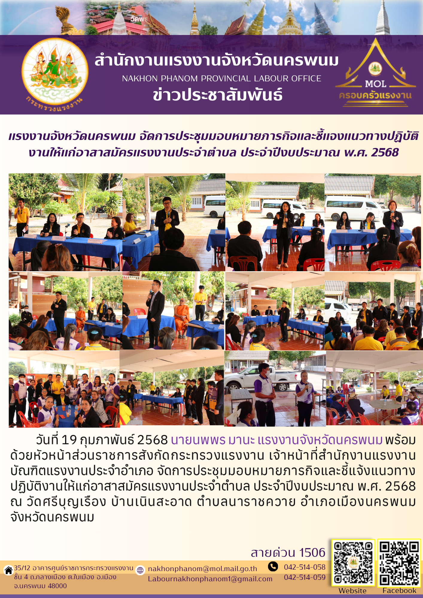 วันที่ 19 กุมภาพันธ์ 2568 นายนพพร มานะ แรงงานจังหวัดนครพนม พร้อมด้วยหัวหน้าส่วนราชการสังกัดกระทรวงแรงงาน เจ้าหน้าที่สำนักงานแรงงาน บัณฑิตแรงงานประจำอำเภอ จัดประชุมมอบหมายภารกิจและชี้แจงแนวทางปฏิบัติงานให้แก่อาสาสมัครแรงงานประจำตำบล ประจำปีงบประมาณ พ.ศ.2568 ณ วัดศรีบุญเรือง บ้านเนินสะอาด ตำบลนาราชควาย อำเภอเมือง จังหวัดนครพนม