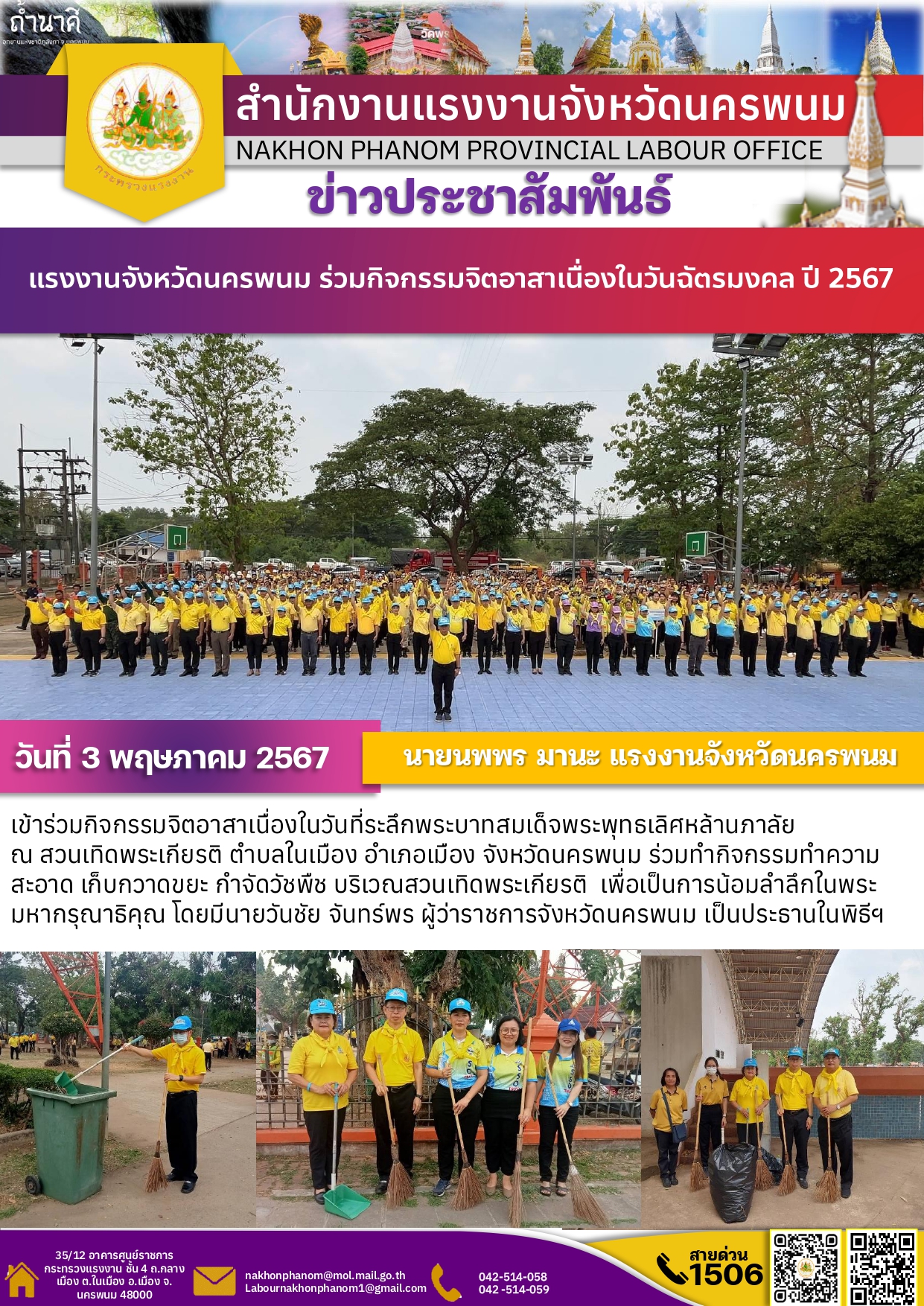 วันที่ 3 พฤษภาคม 2567 นายนพพร มานะ แรงงานจังหวัดนครพนม เข้าร่วมกิจกรรมจิตอาสาเนื่องในวันที่ระลึกพระบาทสมเด็จพระพุทธเลิศหล้านภาลัย