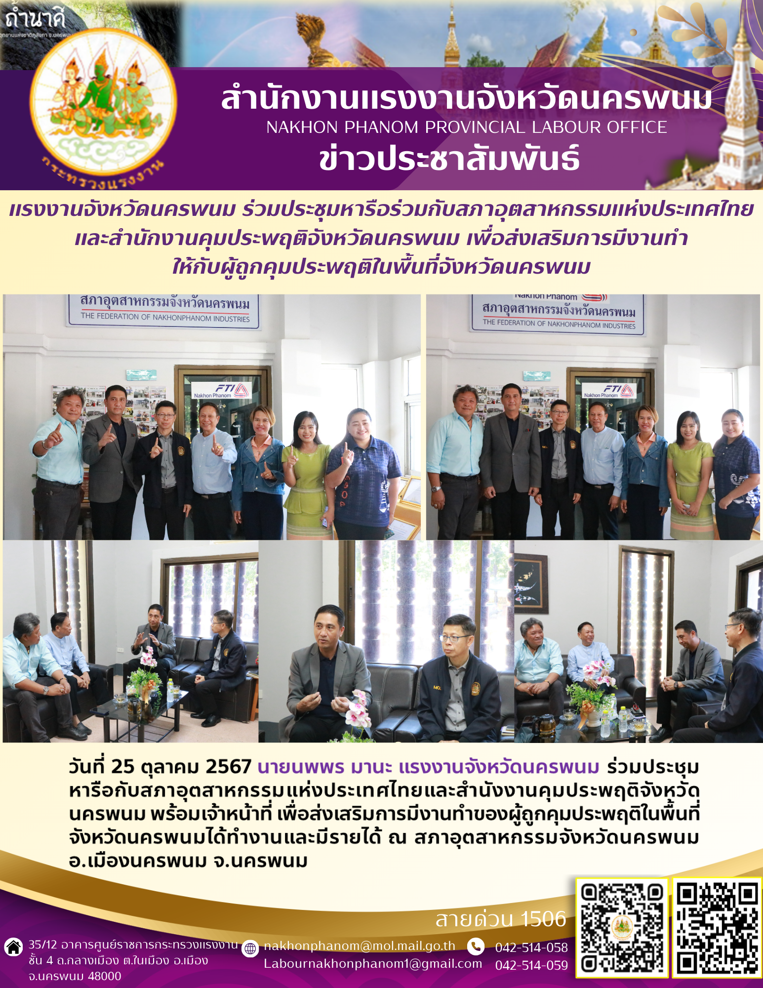 วันที่ 25 ตุลาคม 2567 นายนพพร มานะ แรงงานจังหวัดนครพนม ร่วมประชุมหารือกับสภาอุตสาหกรรมแห่งประเทศไทยและสำนังงานคุมประพฤติจังหวัดนครพนม พร้อมเจ้าหน้าที่ เพื่อส่งเสริมการมีงานทำของผู้ถูกคุมประพฤติในพื้นที่จังหวัดนครพนมได้ทำงานและมีรายได้ ณ สภาอุตสาหกรรมจังหวัดนครพนม