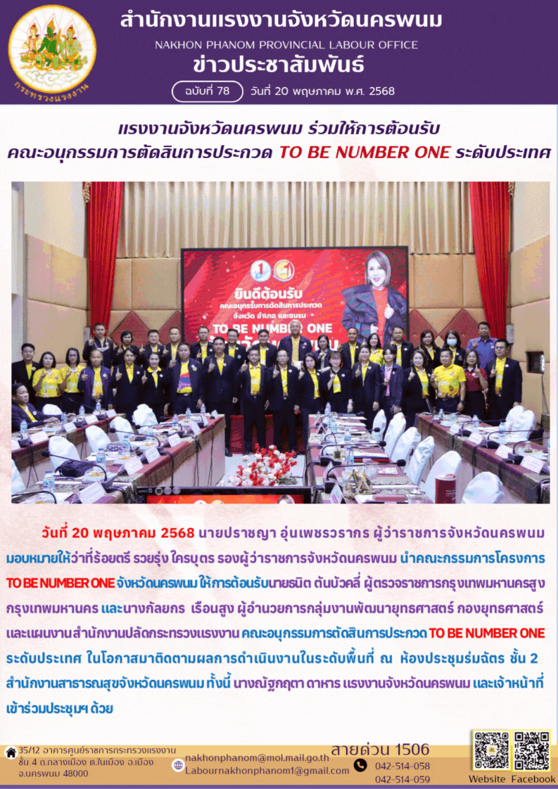 แรงงานจังหวัดนครพนม ร่วมให้การต้อนรับ คณะอนุกรรมการตัดสินการประกวด TO BE NUMBER ONE ระดับประเทศ