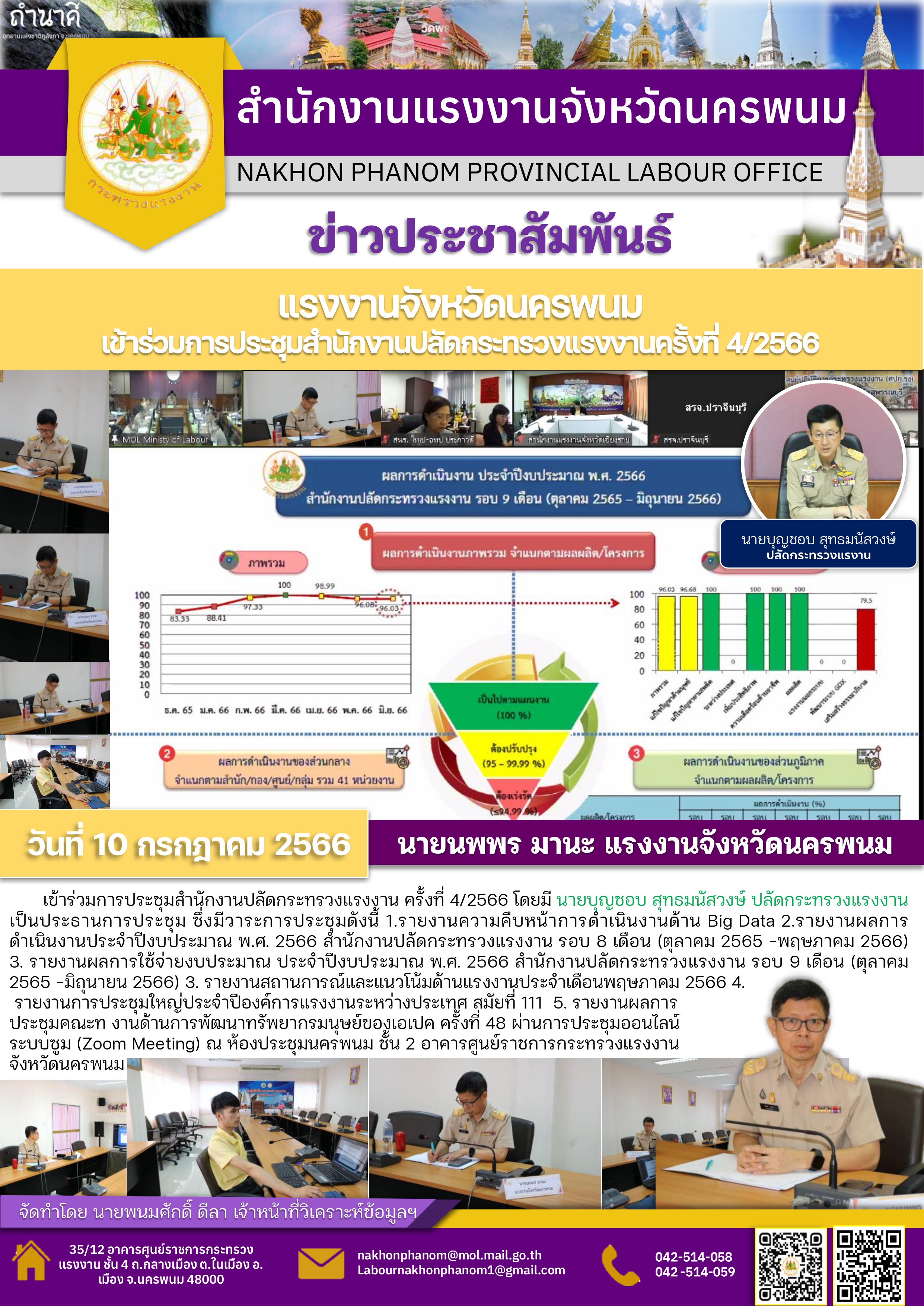 นายนพพร มานะ แรงงานจังหวัดนครพนม เข้าร่วมการประชุมสำนักงานปลัดกระทรวงแรงงาน ครั้งที่ 4/2566 โดยมี นายบุญชอบ สุทธมนัสวงษ์ ปลัดกระทรวงแรงงานเป็นประธานการประชุม ซึ่งมีวาระการประชุมดังนี้ 1.รายงานความคืบหน้าการดำเนินงานด้าน Big Data 2.รายงานผลการดำเนินงานประจำปีงบประมาณ พ.ศ. 2566 สำนักงานปลัดกระทรวงแรงงาน รอบ 8 เดือน (ตุลาคม 2565 –พฤษภาคม 2566)3. รายงานผลการใช้จ่ายงบประมาณ ประจำปีงบประมาณ พ.ศ. 2566 สำนักงานปลัดกระทรวงแรงงาน รอบ 9 เดือน (ตุลาคม 2565 –มิถุนายน 2566) 3. รายงานสถานการณ์และแนวโน้มด้านแรงงานประจำเดือนพฤษภาคม 2566 4.รายงานการประชุมใหญ่ประจำปีองค์การแรงงานระหว่างประเทศ สมัยที่ 111 5. รายงานผลการประชุมคณะท งานด้านการพัฒนาทรัพยากรมนุษย์ของเอเปค ครั้งที่ 48 ผ่านการประชุมออนไลน์ระบบซูม (Zoom Meeting) ณ ห้องประชุมนครพนม ชั้น 2 อาคารศูนย์ราชการกระทรวงแรงงานจังหวัดนครพนม