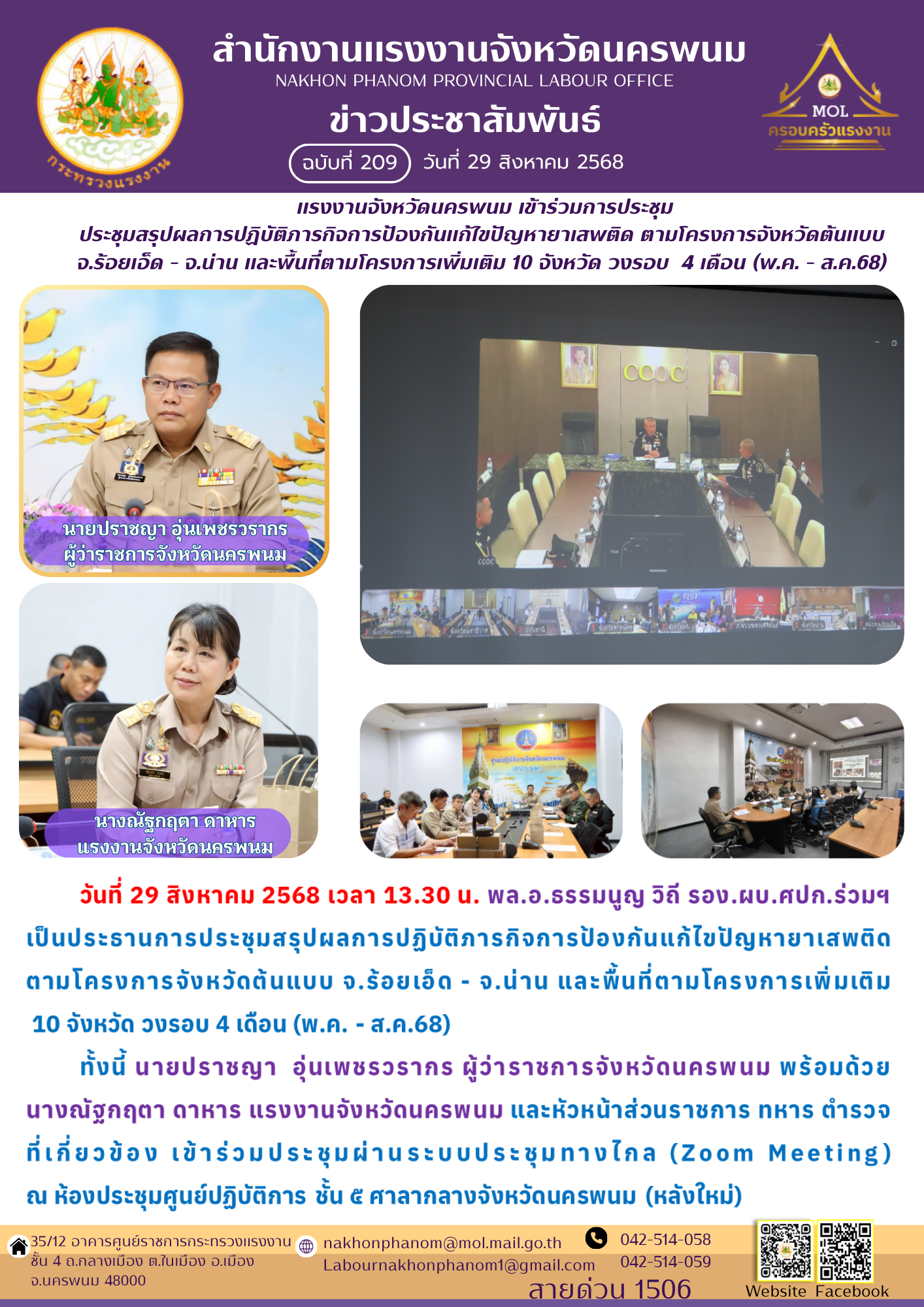 แรงงานจังหวัดนครพนม เข้าร่วมการประชุมสรุปผลการปฏิบัติภารกิจการป้องกันแก้ไขปัญหายาเสพติด ตามโครงการจังหวัดต้นแบบ จ.ร้อยเอ็ด – จ.น่าน และพื้นที่ตามโครงการเพิ่มเติม 10 จังหวัด วงรอบ 4 เดือน (พ.ค. – ส.ค.68)