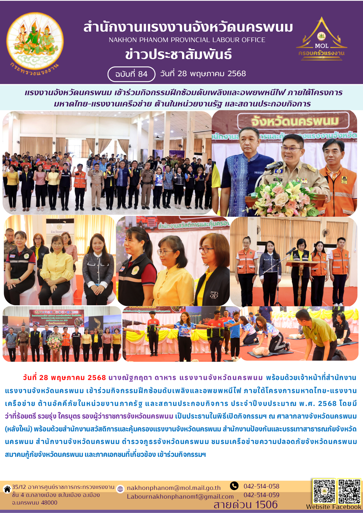 แรงงานจังหวัดนครพนม เข้าร่วมกิจกรรมฝึกซ้อมดับเพลิงและอพยพหนีไฟ ภายใต้โครงการมหาดไทย-แรงงานเครือข่าย ต้านในหน่วยงานรัฐ และสถานประกอบกิจการ