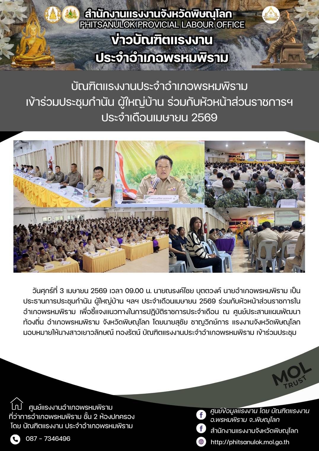 บัณฑิตเเรงงานประจำอำเภอพรหมพิราม เข้าร่วมการประชุมประจำเดือน กำนัน ผู้ใหญ่บ้าน ประจำเดือนเมษายน 2569