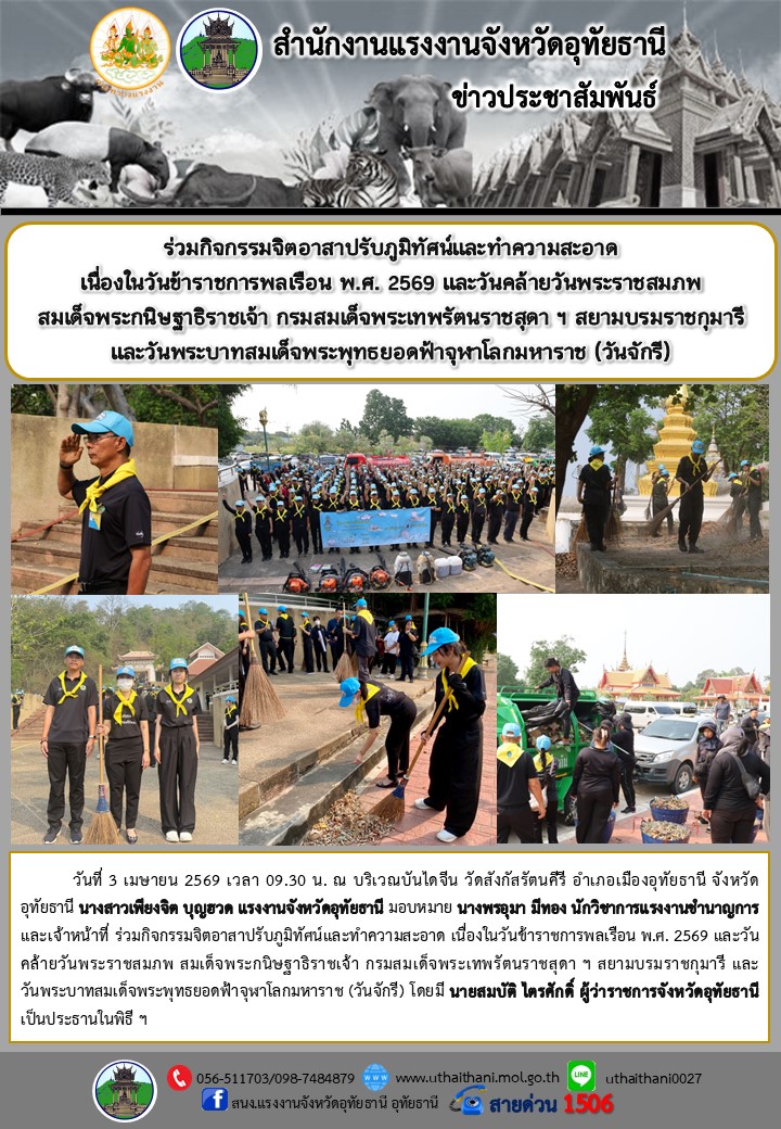 ร่วมกิจกรรมจิตอาสาปรับภูมิทัศน์และทำความสะอาด เนื่องในวันข้าราชการพลเรือน พ.ศ. 2569 และวันคล้ายวันพระราชสมภพ สมเด็จพระกนิษฐาธิราชเจ้า กรมสมเด็จพระเทพรัตนราชสุดา ฯ สยามบรมราชกุมารี และวันพระบาทสมเด็จพระพุทธยอดฟ้าจุฬาโลกมหาราช (วันจักรี)
