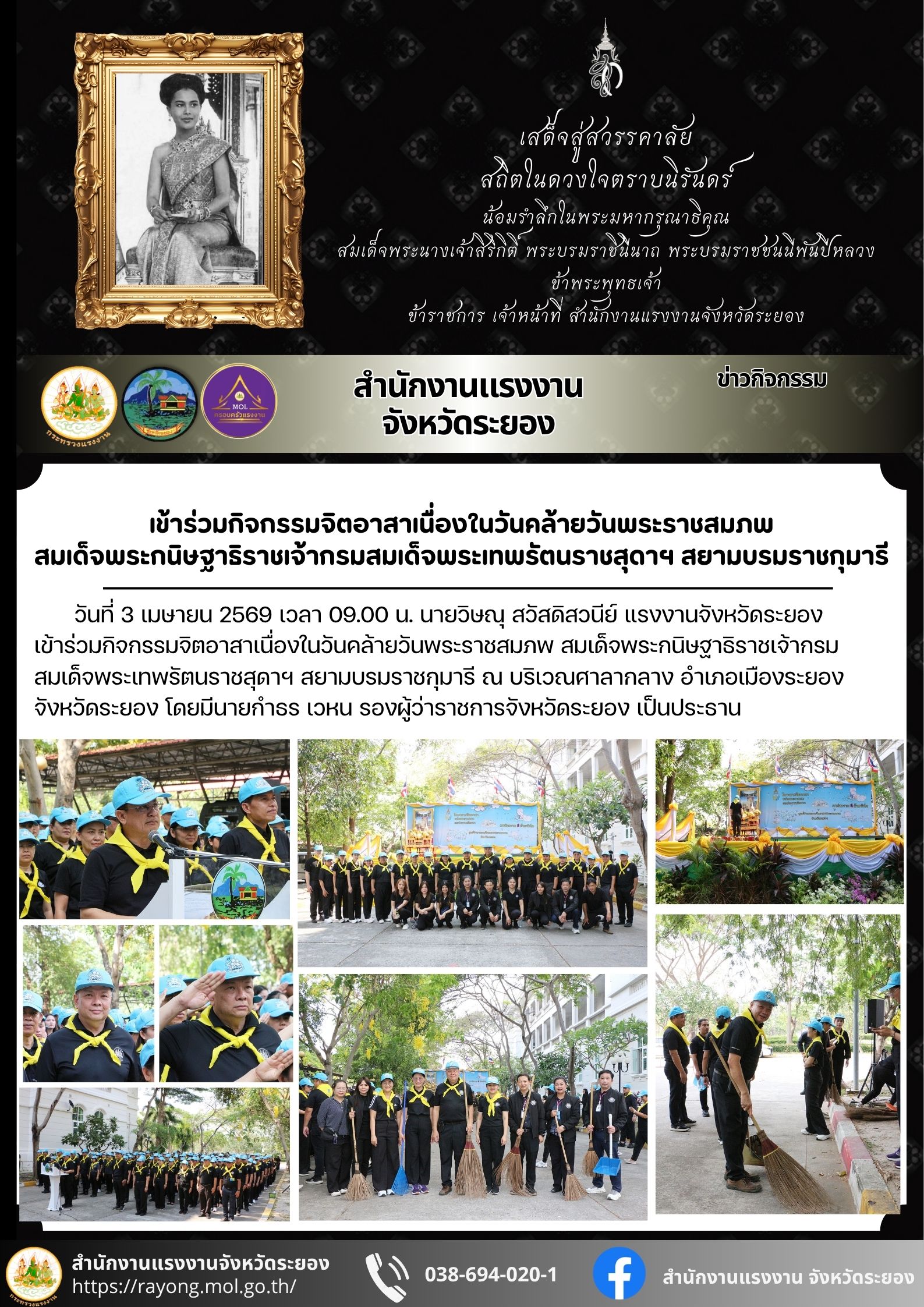 แรงงานจังหวัดระยอง เข้าร่วมกิจกรรมจิตอาสาเนื่องในวันคล้ายวันพระราชสมภพ สมเด็จพระกนิษฐาธิราชเจ้ากรมสมเด็จพระเทพรัตนราชสุดาฯ สยามบรมราชกุมารี