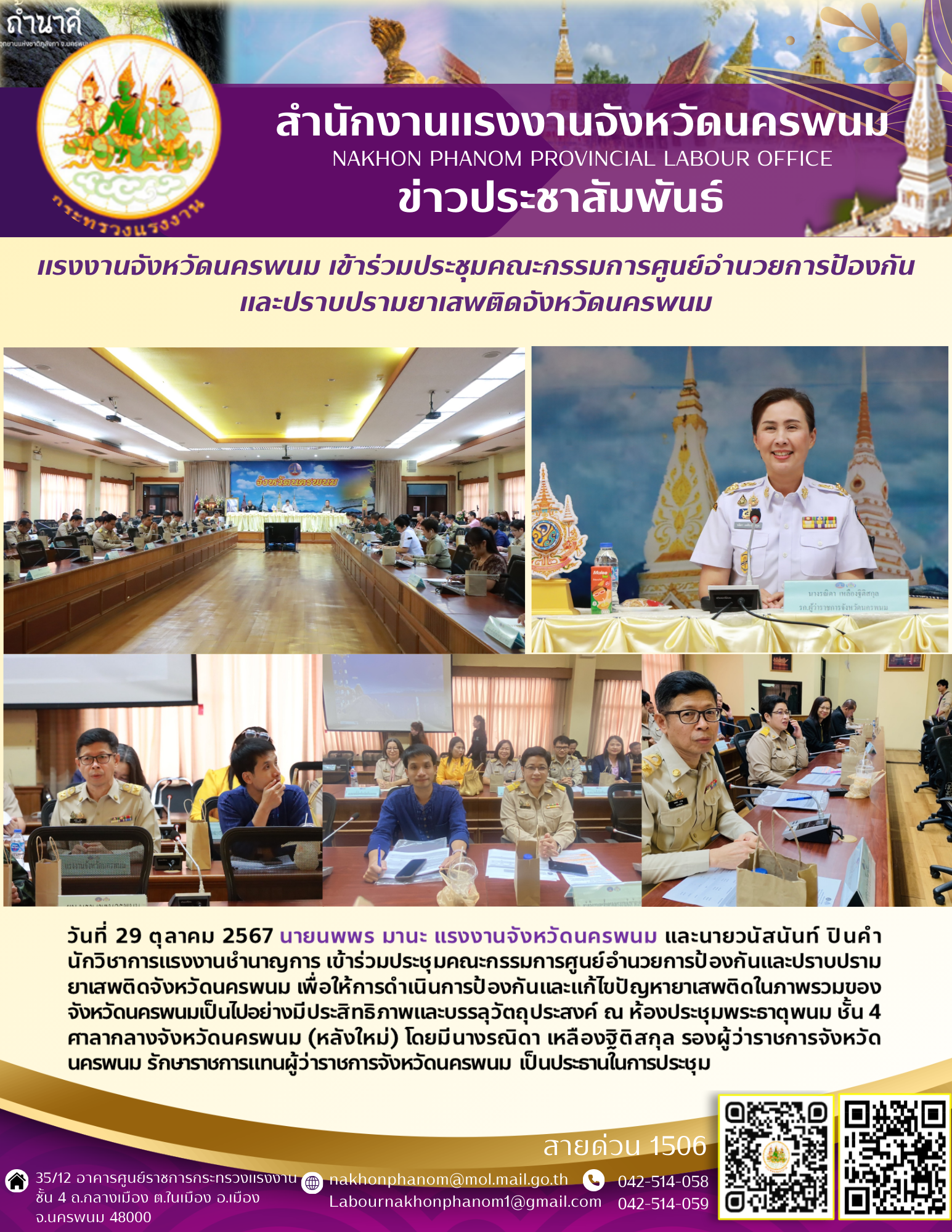 วันที่ 29 ตุลาคม 2567 นายนพพร มานะ แรงงานจังหวัดนครพนม และนายวนัสนันท์ ปินคำ