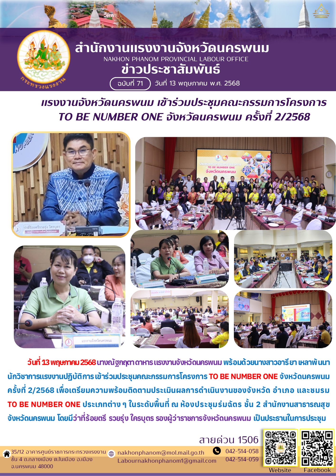 แรงงานจังหวัดนครพนม เข้าร่วมประชุมคณะกรรมการโครงการ TO BE NUMBER ONE จังหวัดนครพนม ครั้งที่ 2/2568