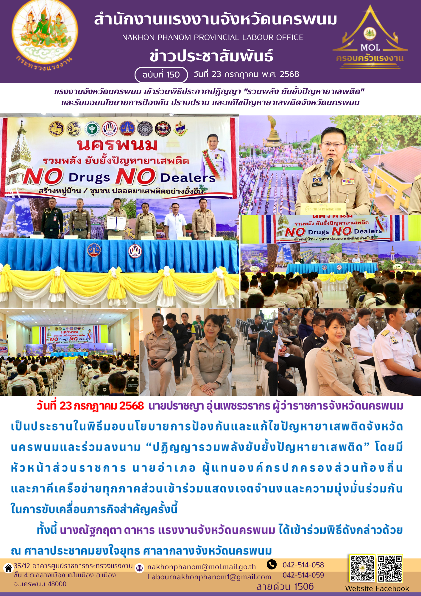 แรงงานจังหวัดนครพนม เข้าร่วมพิธีประกาศปฏิญญา “รวมพลัง ยับยั้งปัญหายาเสพติด” และรับมอบนโยบายการป้องกัน ปราบปราม และแก้ไขปัญหายาเสพติดจังหวัดนครพนม