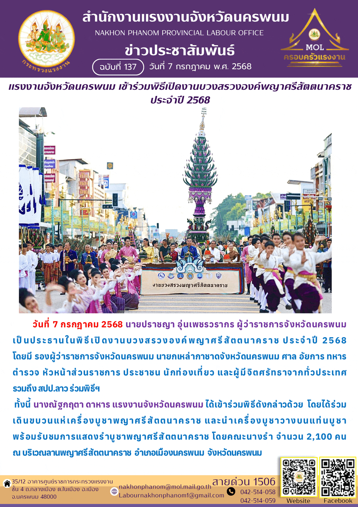 แรงงานจังหวัดนครพนม เข้าร่วมพิธีเปิดงานบวงสรวงองค์พญาศรีสัตตนาคราช ประจำปี 2568