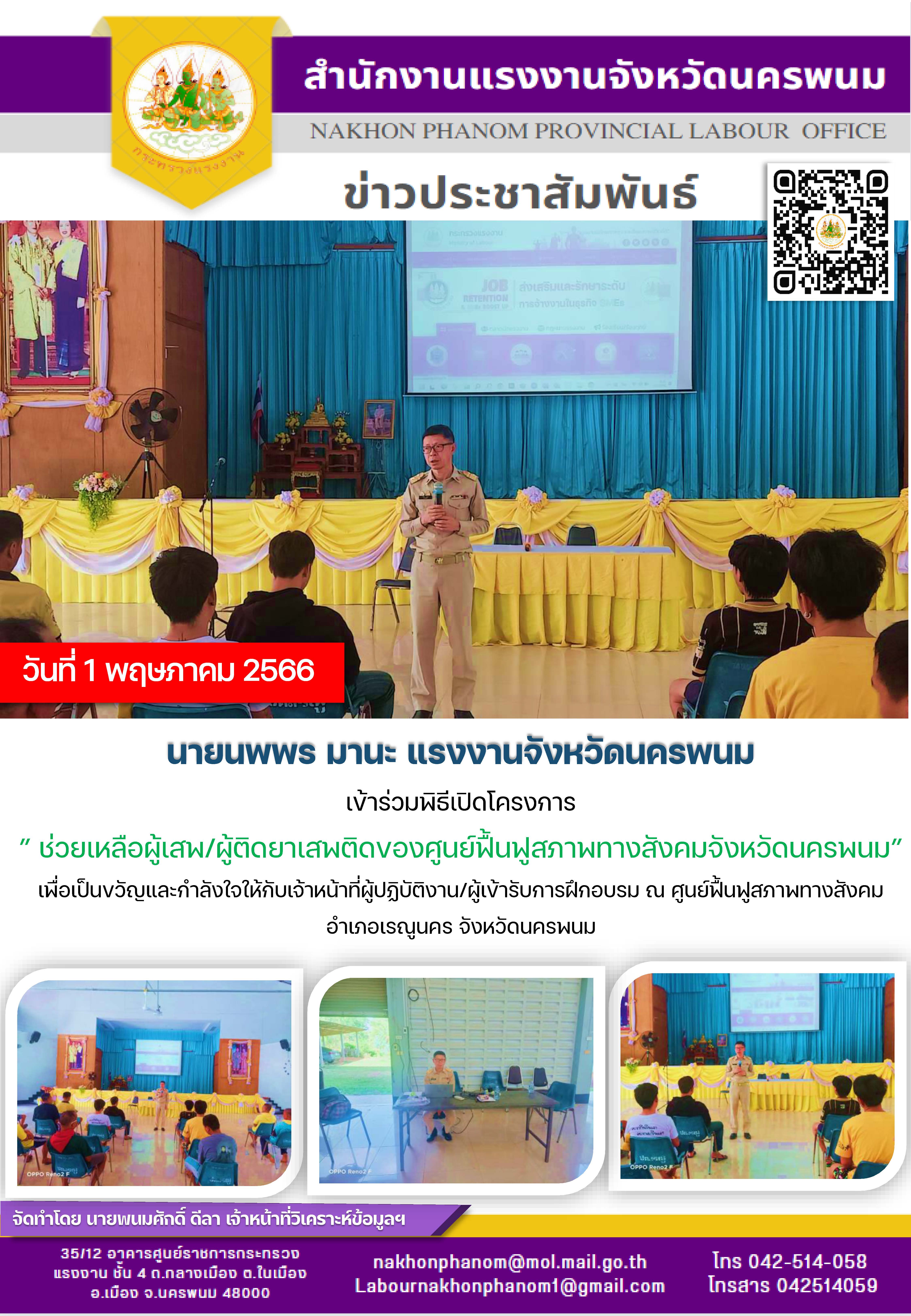 นายนพพร มานะ แรงงานจังหวัดนครพนม เข้าร่วมพิธีเปิดโครงการ ” ช่วยเหลือผู้เสพ/ผู้ติดยาเสพติดของศูนย์ฟื้นฟูสภาพทางสังคมจังหวัดนครพนม”เพื่อเป็นขวัญและกำลังใจให้กับเจ้าหน้าที่ผู้ปฏิบัติงาน/ผู้เข้ารับการฝึกอบรม ณ ศูนย์ฟื้นฟูสภาพทางสังคมอำเภอเรณูนคร จังหวัดนครพนม