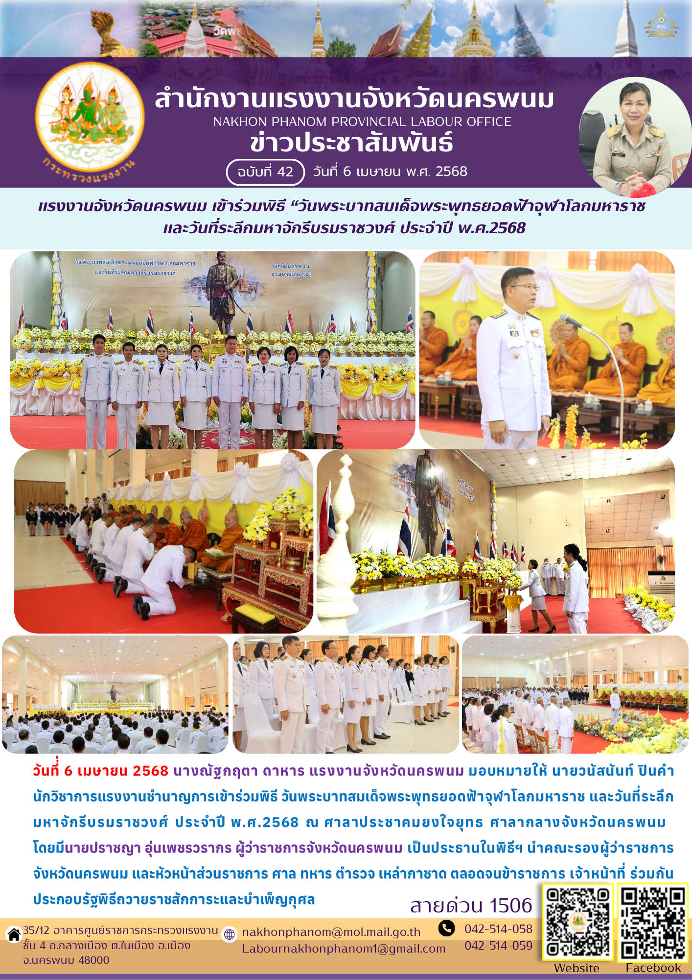 แรงงานจังหวัดนครพนม เข้าร่วมพิธี “วันพระบาทสมเด็จพระพุทธยอดฟ้าจุฬาโลกมหาราช และวันที่ระลึกมหาจักรีบรมราชวงศ์ ประจำปี พ.ศ.2568