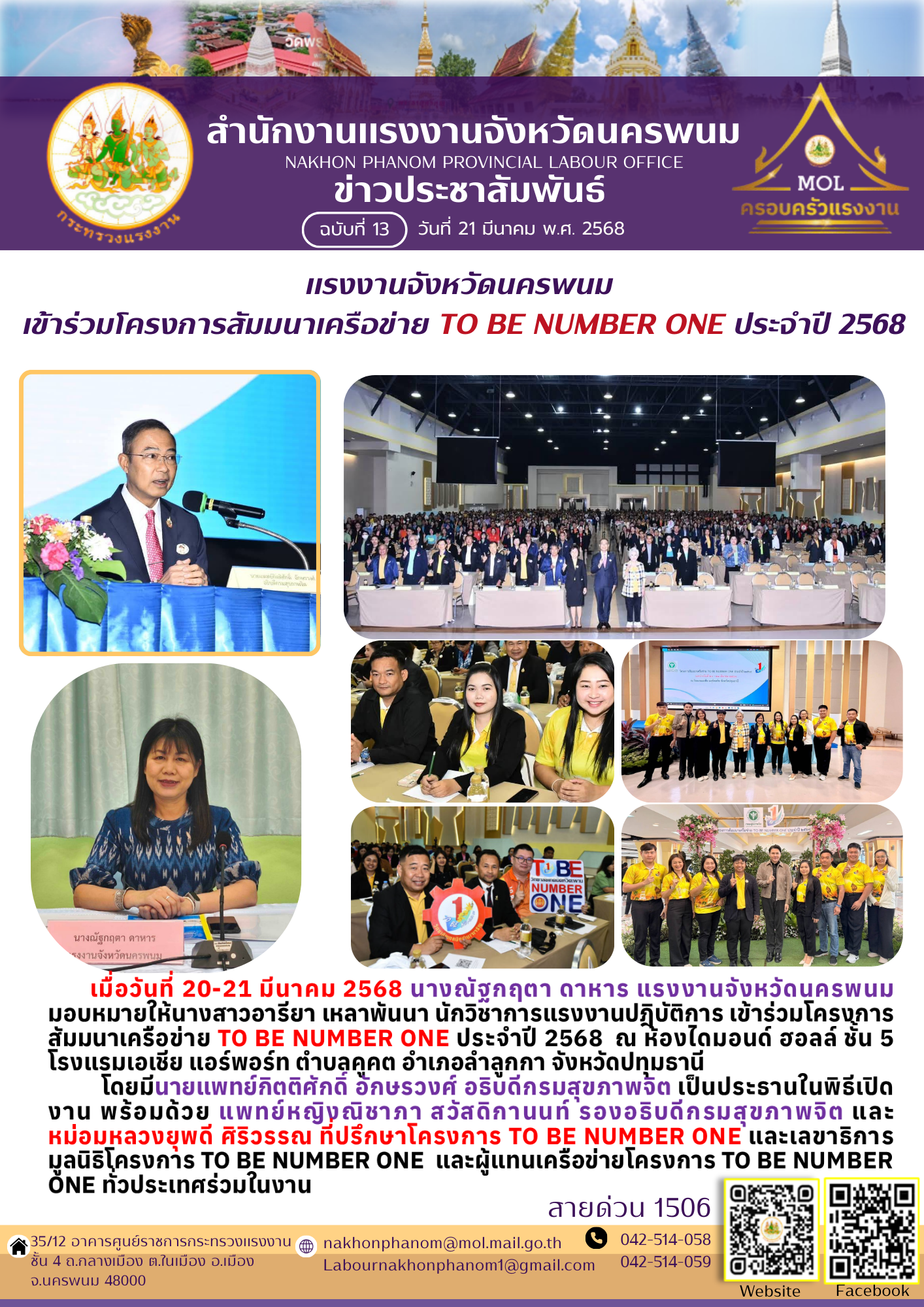 แรงงานจังหวัดนครพนม เข้าร่วมโครงการสัมมนาเครือข่าย TO BE NUMBER ONE ประจำปี 2568