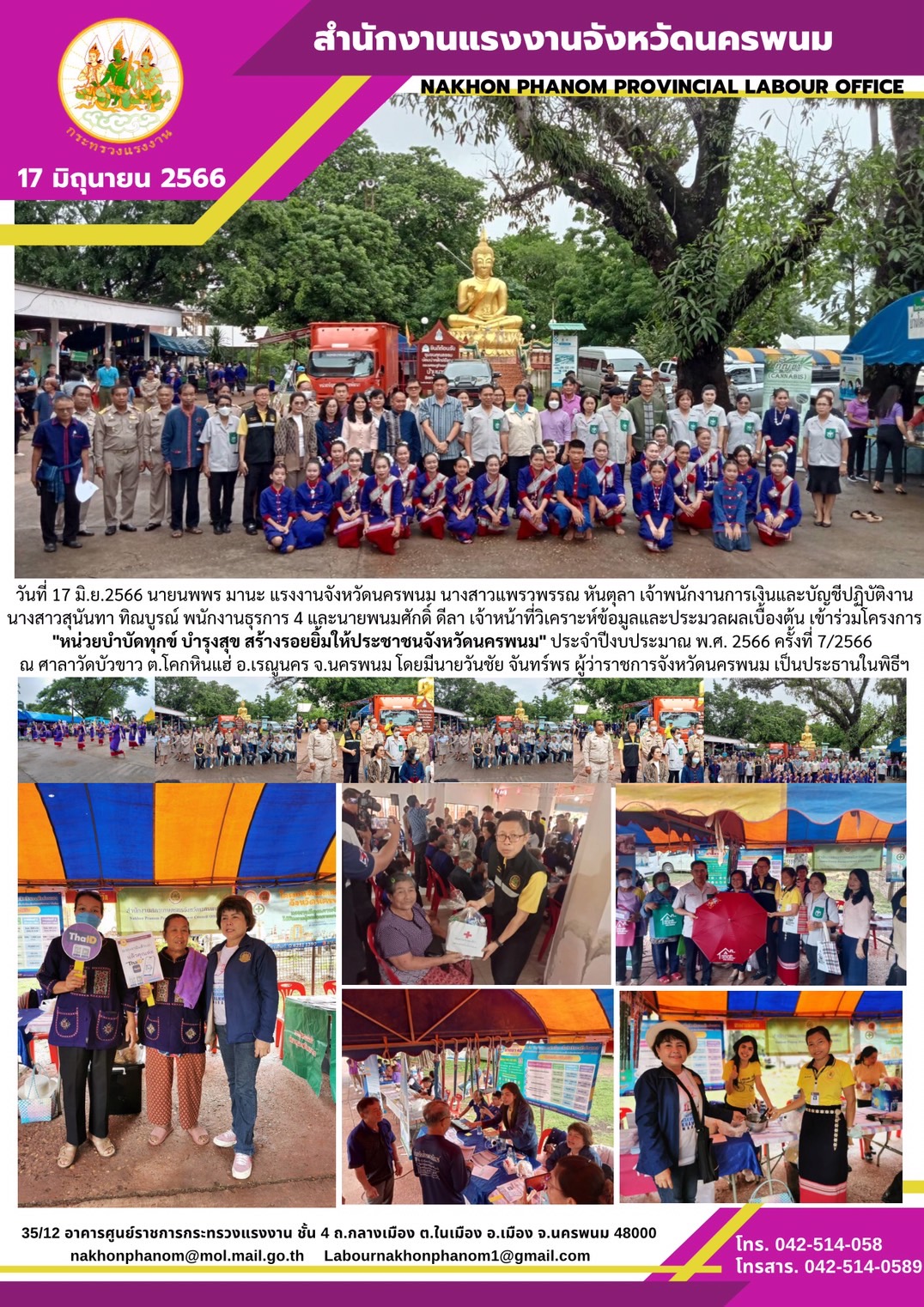 วันที่ 17 มิ.ย.2566 นายนพพร มานะ แรงงานจังหวัดนครพนม นางสาวแพรวพรรณ หันตุลา เจ้าพนักงานการเงินและบัญชีปฏิบัติงาน นางสาวสุนันทา ทิณบูรณ์ พนักงานธุรการ 4 และนายพนมศักดิ์ ดีลา เจ้าหน้าที่วิเคราะห์ข้อมูลและประมวลผลเบื้องต้น เข้าร่วมโครงการ “หน่วยบำบัดทุกข์ บำรุงสุข สร้างรอยยิ้มให้ประชาชนจังหวัดนครพนม” ประจำปีงบประมาณ พ.ศ. 2566 ครั้งที่ 7/2566 ณ ศาลาวัดบัวขาว ต.โคกหินแฮ่ อ.เรณูนคร จ.นครพนม โดยมีนายวันชัย จันทร์พร ผู้ว่าราชการจังหวัดนครพนม เป็นประธานในพิธีฯ