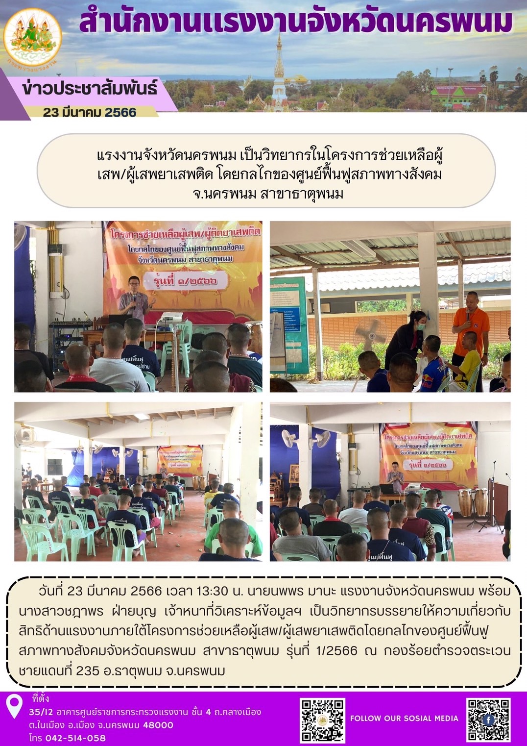 สรจ.นครพนม เป็นวิทยากรในโครงการช่วยเหลือผู้ เสพ/ผู้เสพยาเสพติด โดยกลไกของศูนย์ฟื้นฟูสภาพทางสังคม จ.นครพนม สาขาธาตุพนม