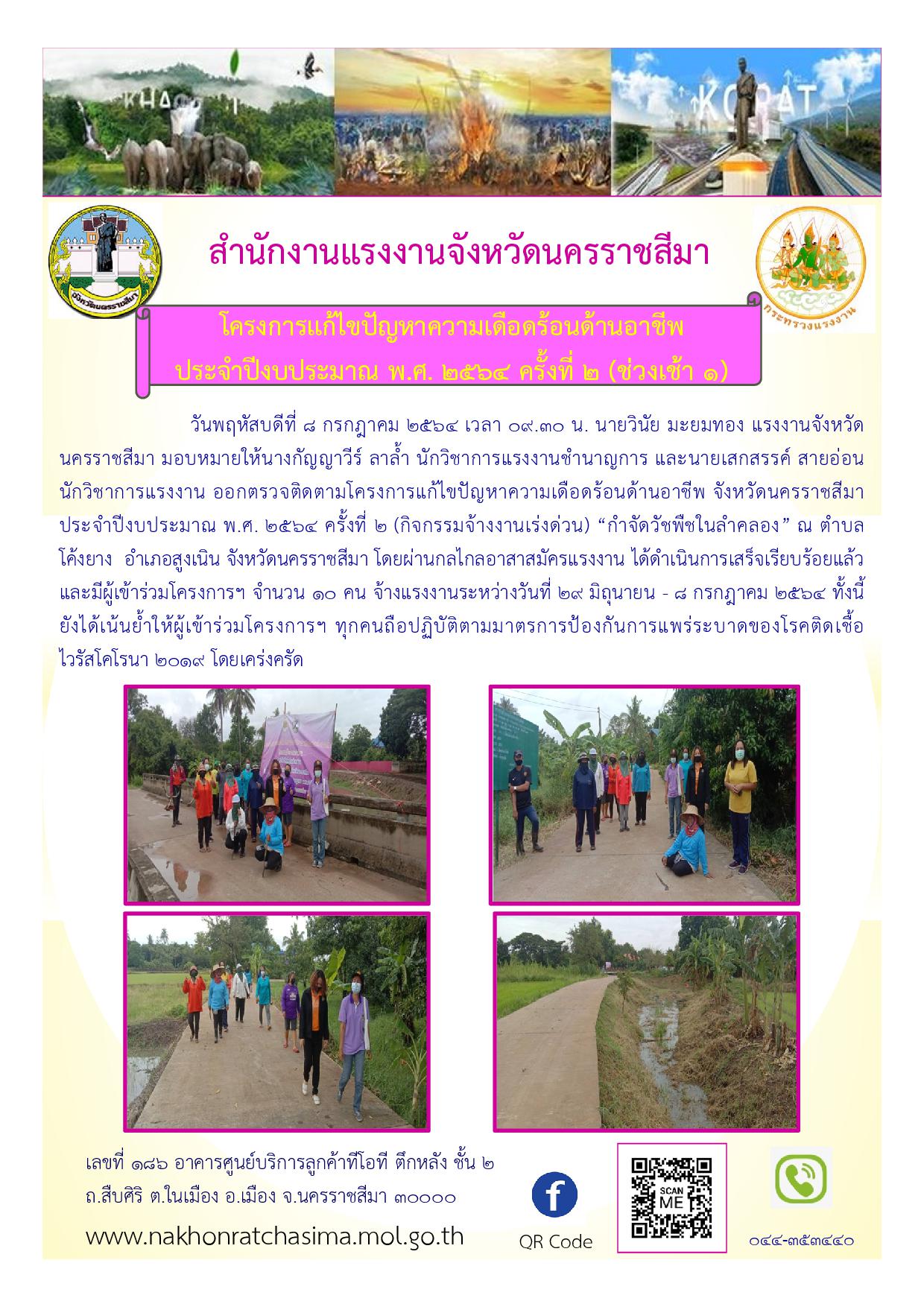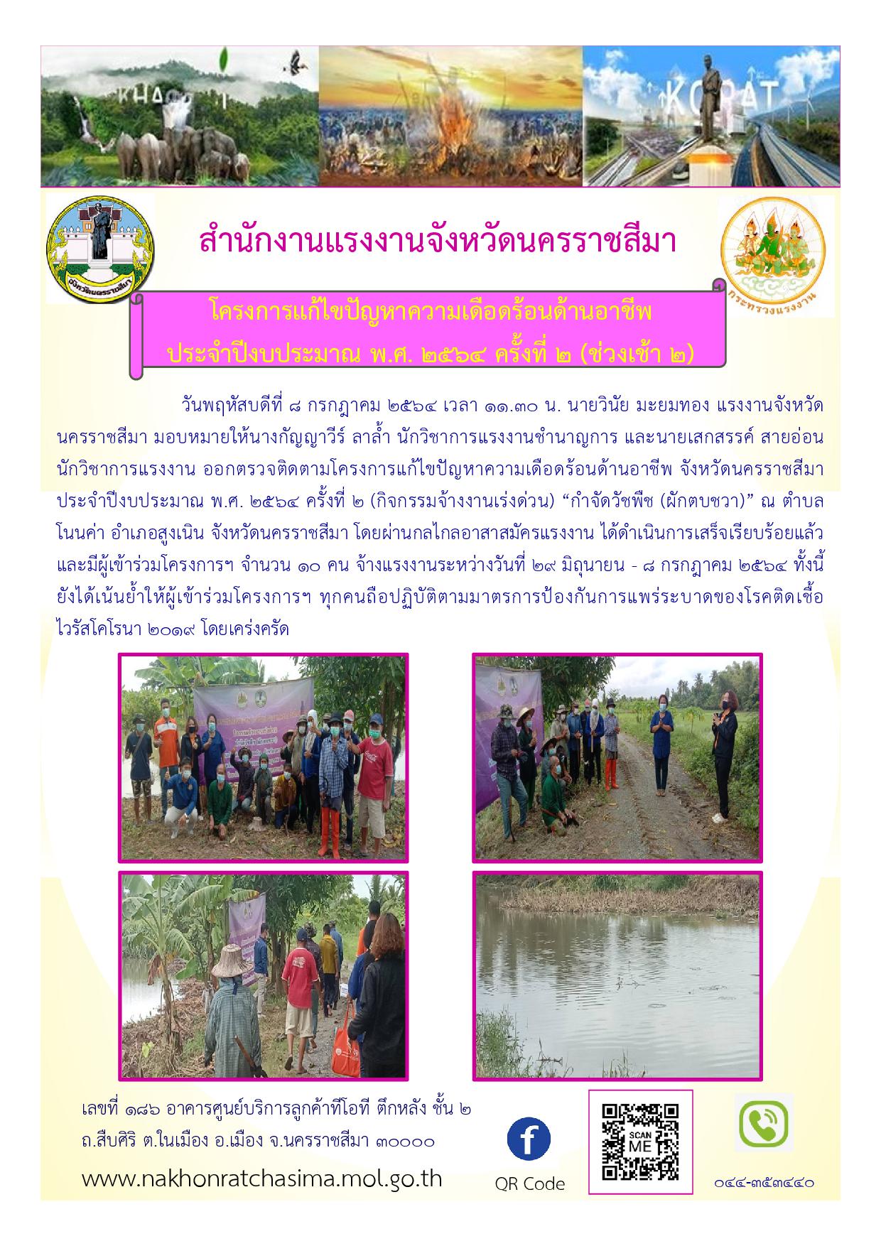 วันพฤหัสบดีที่ 8 กรกฎาคม 2564 นายวินัย มะยมทอง แรงงานจังหวัดนครราชสีมา มอบหมายให้นางกัญญาวีร์ ลาล้ำ นักวิชาการแรงงานชำนาญการ และนายเสกสรรค์ สายอ่อน นักวิชาการแรงงาน ออกตรวจติดตามโครงการแก้ไขปัญหาความเดือดร้อนด้านอาชีพ จังหวัดนครราชสีมา ประจำปีงบประมาณ พ.ศ. 2564 ครั้งที่ 2 ดังนี้