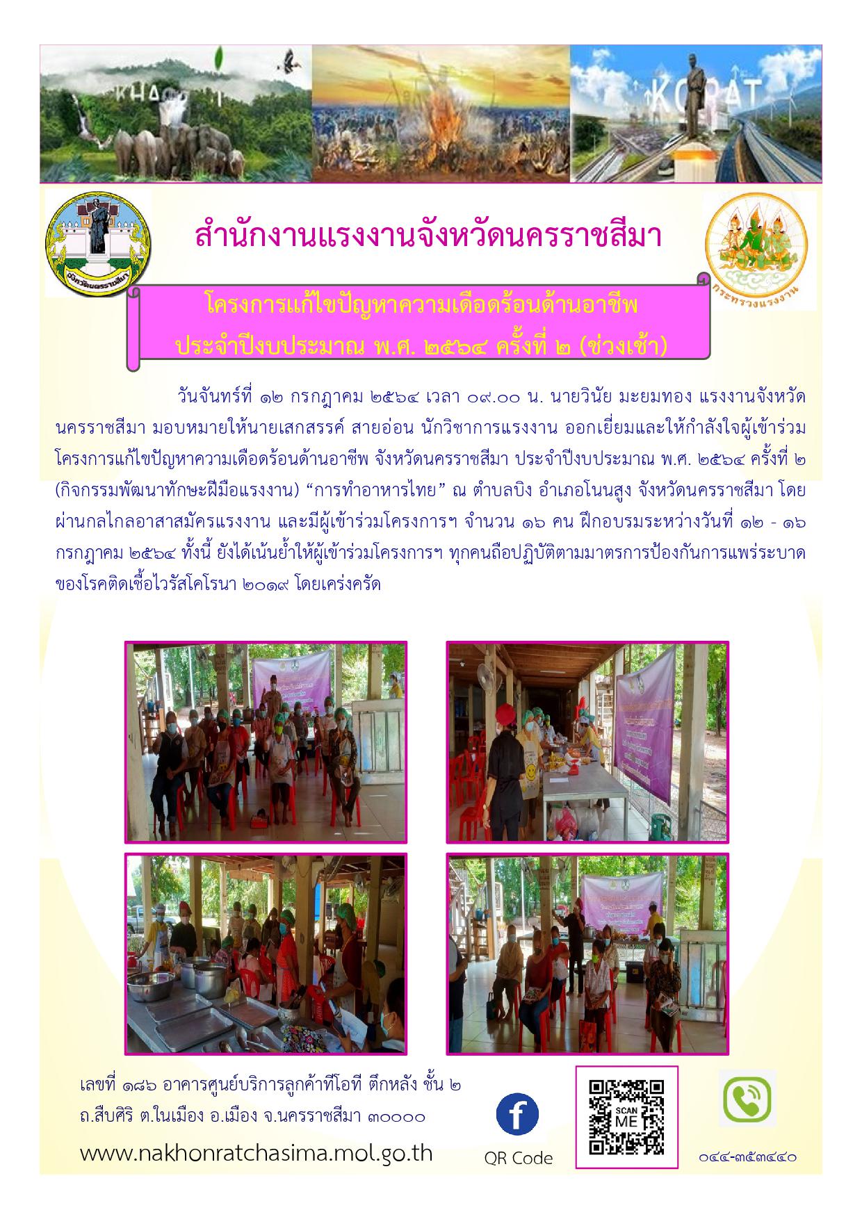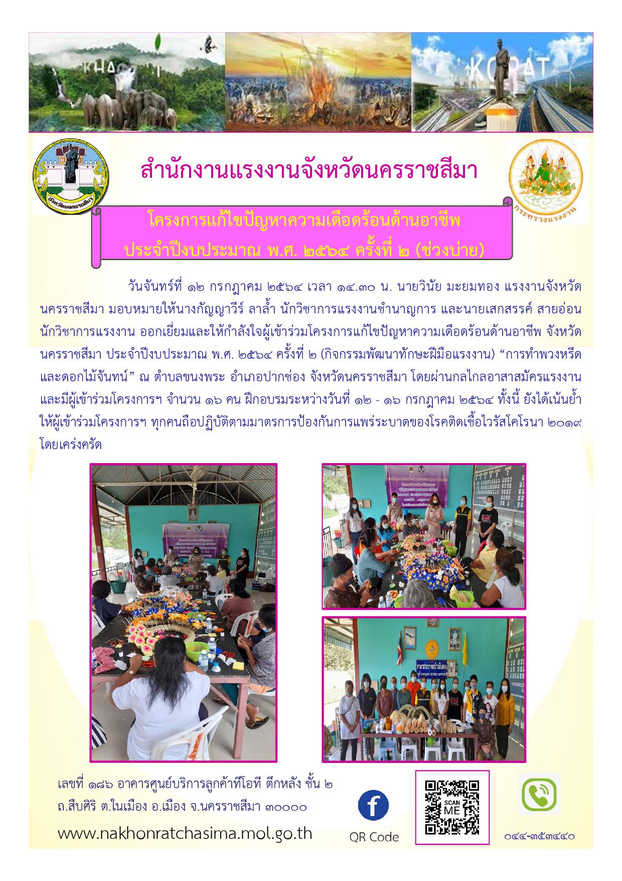 วันจันทร์ที่ 12 กรกฎาคม 2564 นายวินัย มะยมทอง แรงงานจังหวัดนครราชสีมา มอบหมายให้นางกัญญาวีร์ ลาล้ำ นักวิชาการแรงงานชำนาญการ และนายเสกสรรค์ สายอ่อน นักวิชาการแรงงาน ออกเยี่ยมและให้กำลังใจผู้เข้าร่วมโครงการแก้ไขปัญหาความเดือดร้อนด้านอาชีพ จังหวัดนครราชสีมา ประจำปีงบประมาณ พ.ศ. 2564 ครั้งที่ 2 ดังนี้
