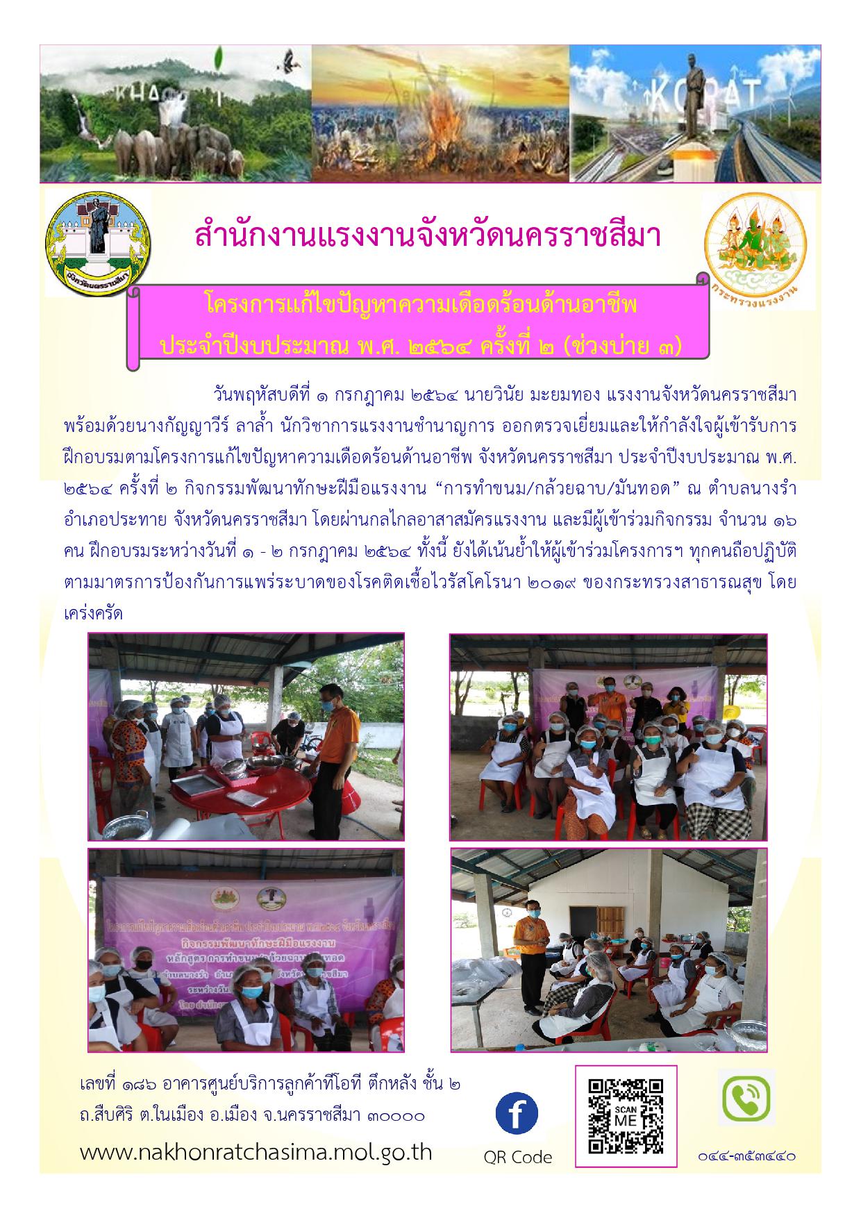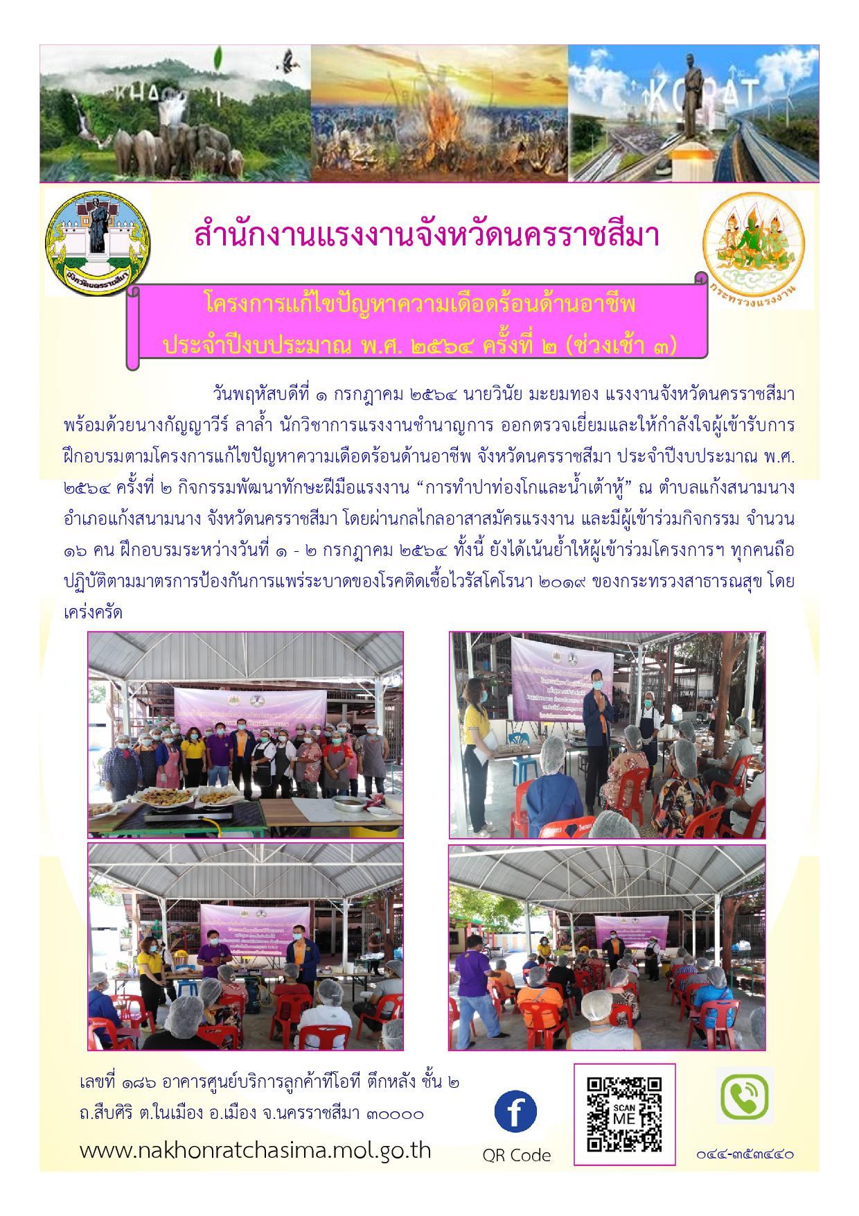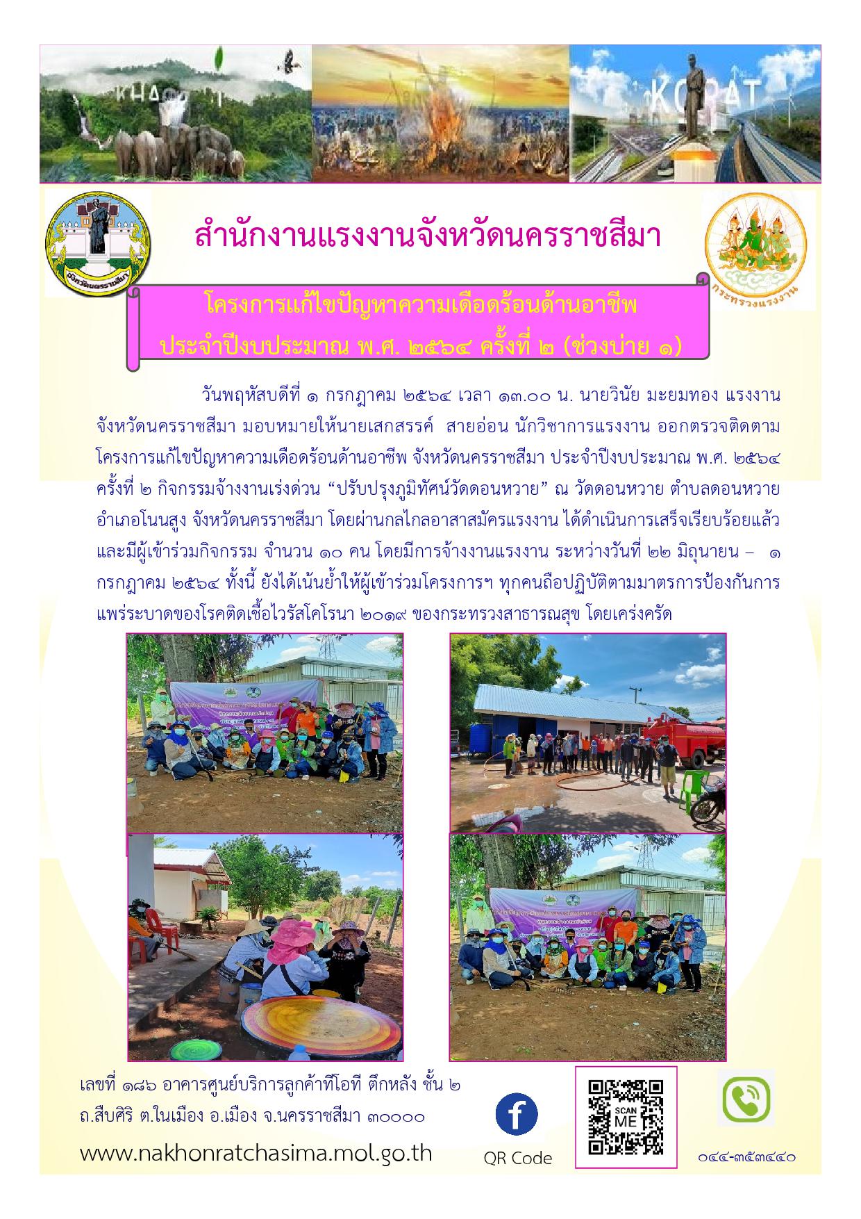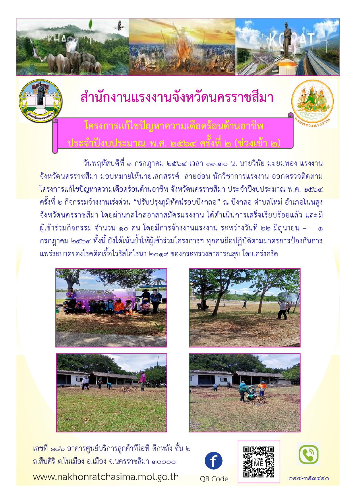 วันพฤหัสบดีที่ 1 กรกฎาคม 2564 นายวินัย มะยมทอง แรงงานจังหวัดนครราชสีมา พร้อมด้วยนางกัญญาวีร์ ลาล้ำ นักวิชาการแรงงานชำนาญการ และนายเสกสรรค์ สายอ่อน นักวิชาการแรงงาน ออกตรวจติดตามโครงการแก้ไขปัญหาความเดือดร้อนด้านอาชีพ จังหวัดนครราชสีมา ประจำปีงบประมาณ พ.ศ. 2564 ครั้งที่ 2 ดังนี้