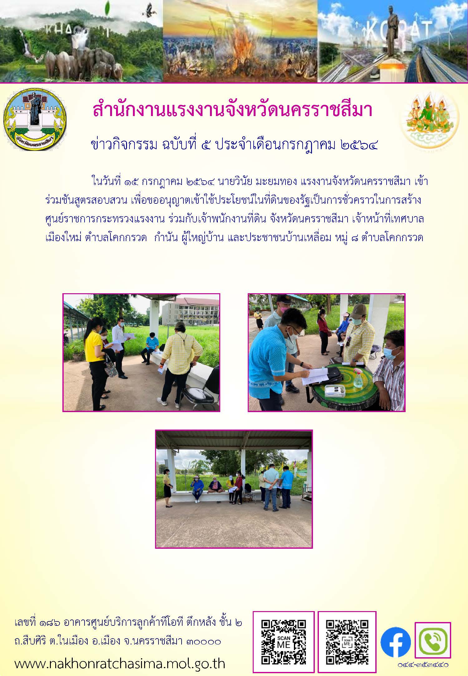 นายวินัย มะยมทอง แรงงานจังหวัดนครราชสีมา เข้าร่วมชันสูตรสอบสวน เพื่อขออนุญาตเข้าใช้ประโยชน์ในที่ดินของรัฐเป็นการชั่วคราวในการสร้างศูนย์ราชการกระทรวงแรงงาน ร่วมกับเจ้าพนักงานที่ดิน จังหวัดนครราชสีมา เจ้าหน้าที่เทศบาลเมืองใหม่ ตำบลโคกกรวด กำนัน ผู้ใหญ่บ้าน และประชาชนบ้านเหลื่อม หมู่ 8 ตำบลโคกกรวด