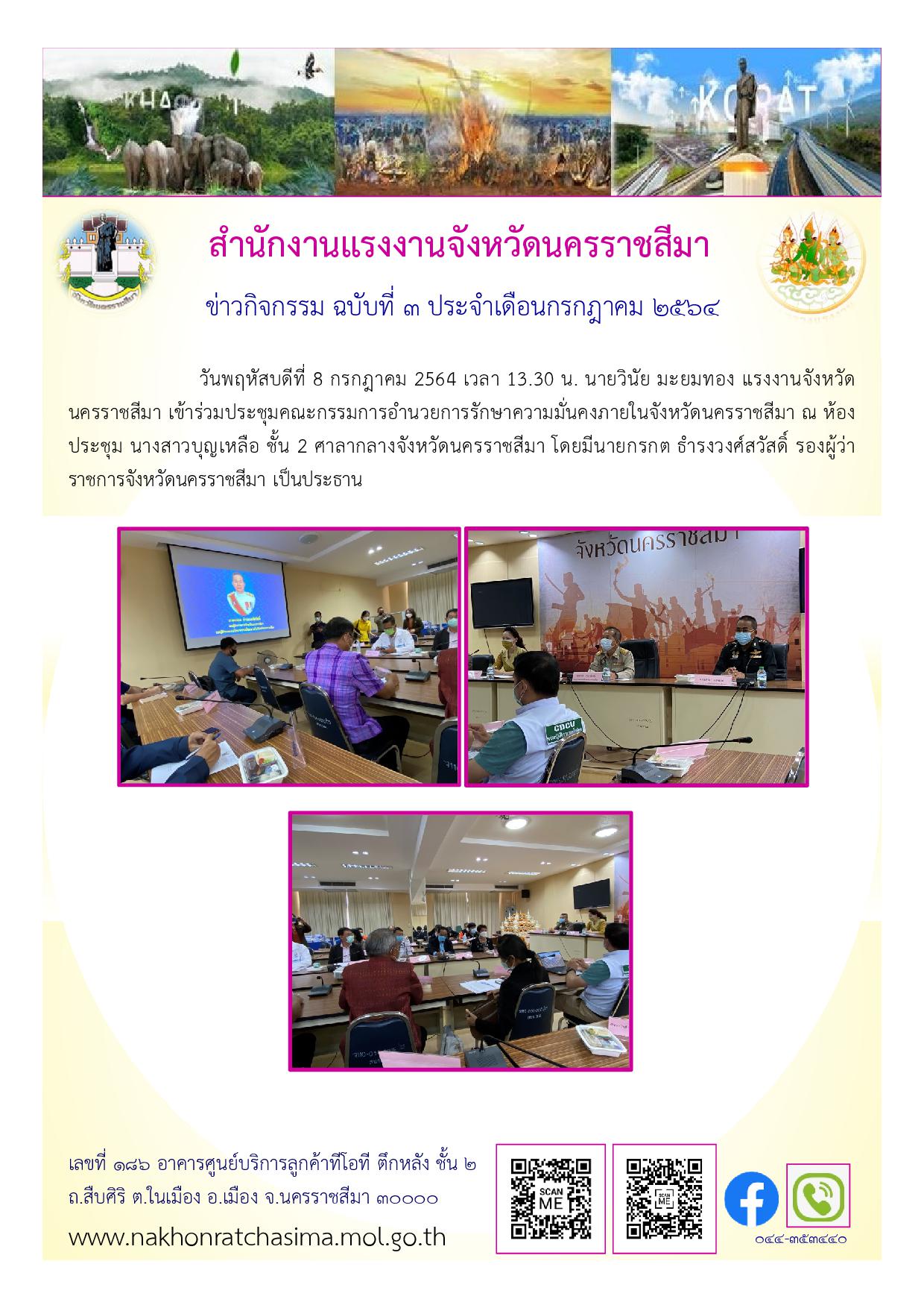 วันพฤหัสบดีที่ 8 กรกฎาคม 2564 เวลา 13.30 น. นายวินัย มะยมทอง แรงงานจังหวัดนครราชสีมา เข้าร่วมประชุมคณะกรรมการอำนวยการรักษาความมั่นคงภายในจังหวัดนครราชสีมา ณ ห้องประชุม นางสาวบุญเหลือ ชั้น 2 ศาลากลางจังหวัดนครราชสีมา โดยมีนายกรกต ธำรงวงศ์สวัสดิ์ รองผู้ว่าราชการจังหวัดนครราชสีมา เป็นประธาน