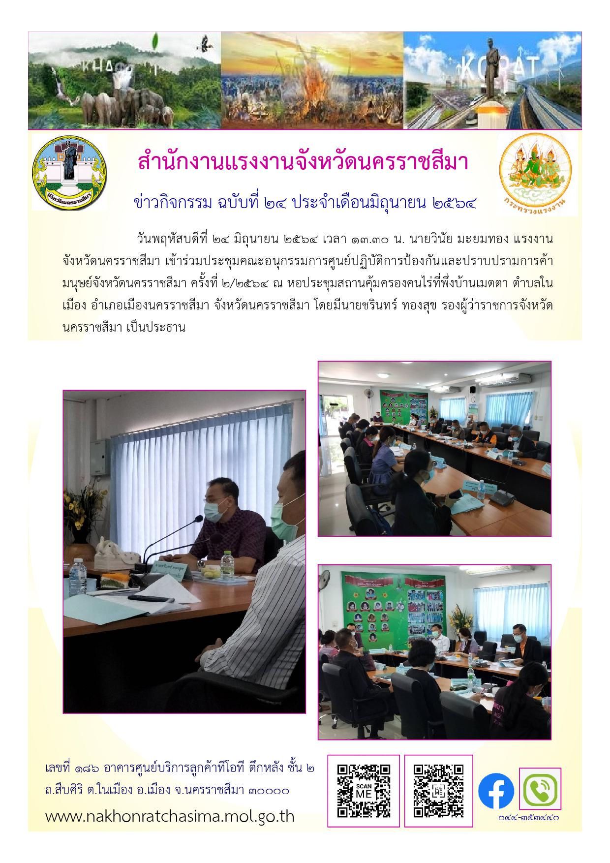 วันพฤหัสบดีที่ 24 มิถุนายน 2564 เวลา 13.30 น. นายวินัย มะยมทอง แรงงานจังหวัดนครราชสีมา เข้าร่วมประชุมคณะอนุกรรมการศูนย์ปฏิบัติการป้องกันและปราบปรามการค้ามนุษย์จังหวัดนครราชสีมา ครั้งที่ 2/2564 ณ หอประชุมสถานคุ้มครองคนไร่ที่พึ่งบ้านเมตตา ตำบลในเมือง อำเภอเมืองนครราชสีมา จังหวัดนครราชสีมา โดยมีนายชรินทร์ ทองสุข รองผู้ว่าราชการจังหวัดนครราชสีมา เป็นประธาน