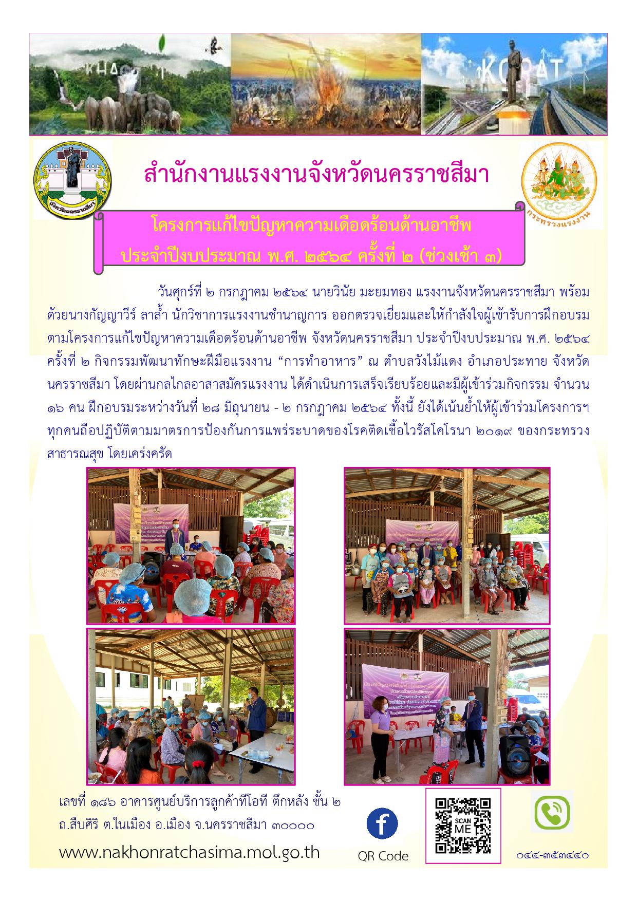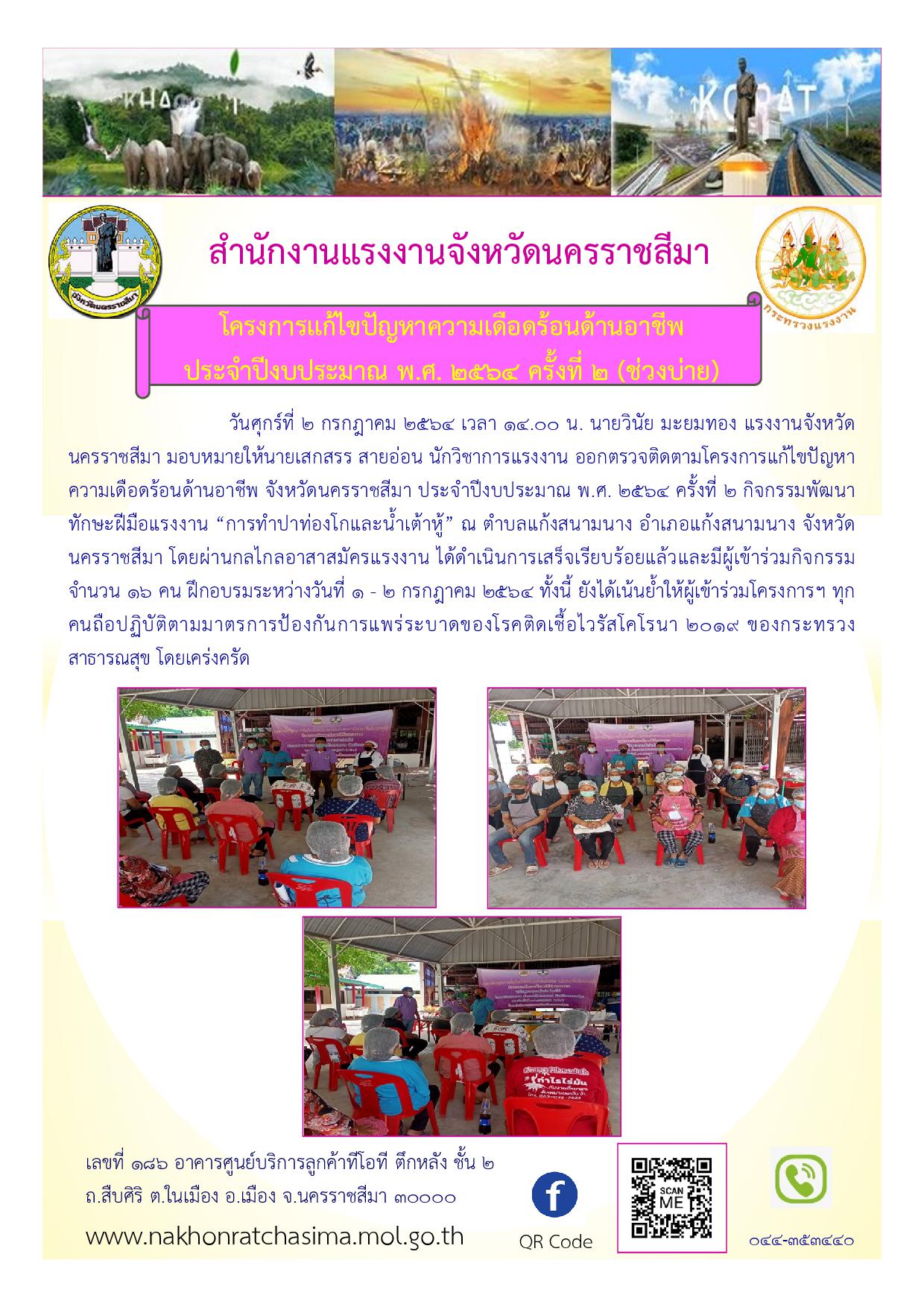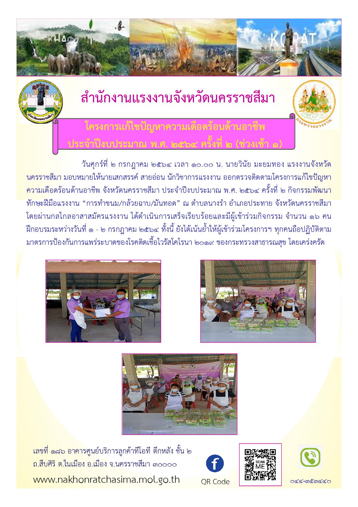 วันศุกร์ที่ 2 กรกฎาคม 2564 นายวินัย มะยมทอง แรงงานจังหวัดนครราชสีมา พร้อมด้วยนางกัญญาวีร์ ลาล้ำ นักวิชาการแรงงานชำนาญการ และนายเสกสรรค์ สายอ่อน นักวิชาการแรงงาน ออกตรวจติดตามโครงการแก้ไขปัญหาความเดือดร้อนด้านอาชีพ จังหวัดนครราชสีมา ประจำปีงบประมาณ พ.ศ. 2564 ครั้งที่ 2 ดังนี้