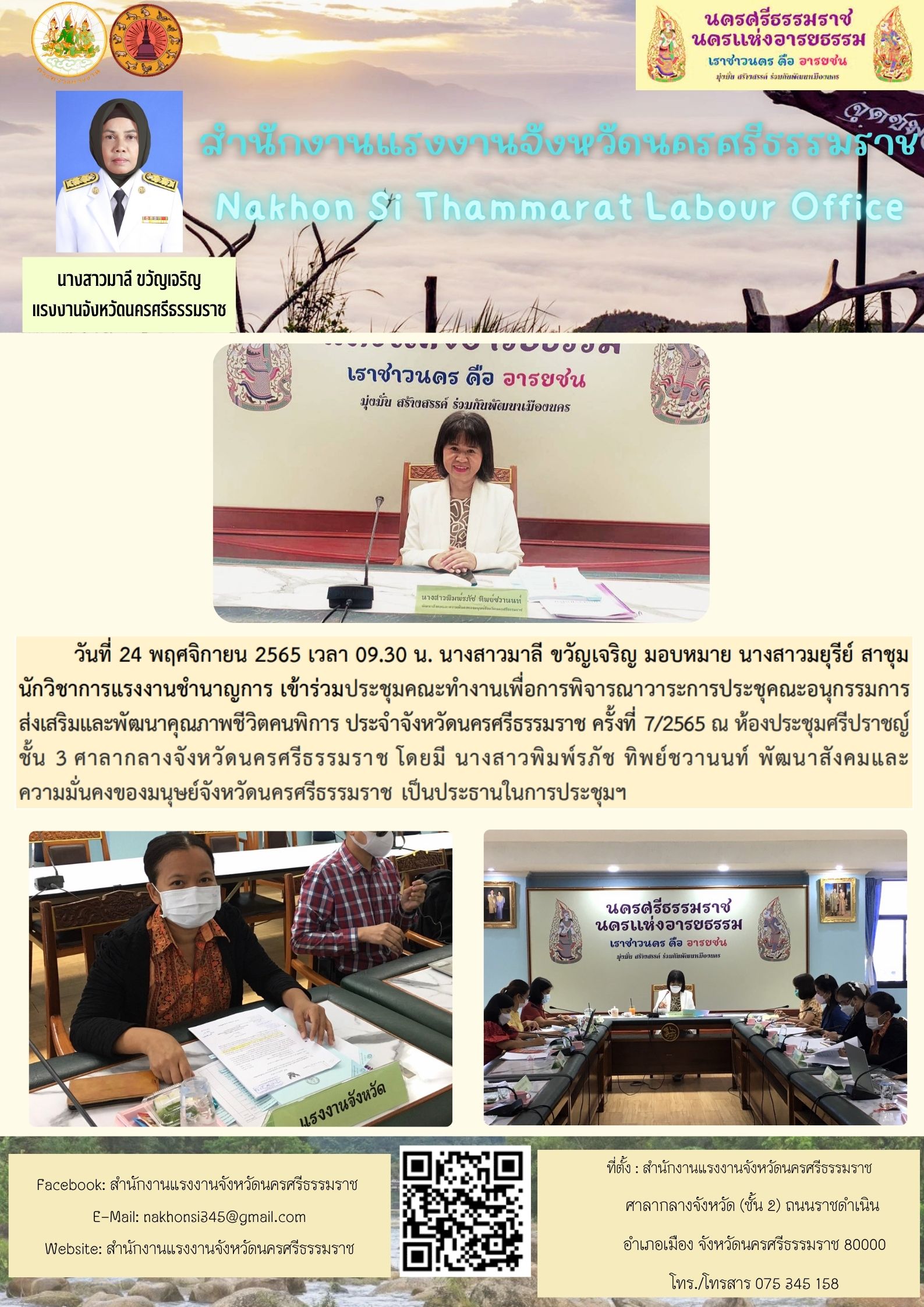 แรงงานจังหวัดนครศรีธรรมราช มอบหมายนางสาวมยุรีย์ สาชุม นักวิชาการแรงงานชำนาญการ เข้าร่วมประชุมคณะทำงานเพื่อการพิจารณาวาระการประชุมคณะอนุกรรมการส่งเสริมและพัฒนาคุณภาพชีวิตคนพิการ ประจำจังหวัดนครศรีธรรมราช ครั้งที่ 7/2565 ณ ห้องประชุมศรีปราชญ์ ชั้น 3 ศาลากลางจังหวัดนครศรีธรรมราช โดยมี นางสาวพิมพ์รภัช ทิพย์ชวานนท์ พัฒนาสังคมและความมั่นคงของมนุษย์จังหวัดนครศรีธรรมราช เป็นประธานในการประชุมฯ