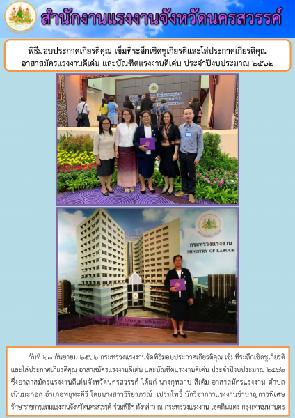 วันที่ 23 กันยายน 2562 กระทรวงแรงงานจัดพิธีมอบประกาศเกียรติคุณ เข็มที่ระลึกเชิดชูเกียรติและโล่ประกาศเกียรติคุณ อาสาสมัครแรงงานดีเด่น และบัณฑิตแรงงานดีเด่น ประจำปีงบประมาณ 2562 ซึ่งอาสาสมัครแรงงานดีเด่นจังหวัดนครสวรรค์ ได้แก่ นางกุหลาบ สีเต็ม อาสาสมัครแรงงาน ตำบล เนินมะกอก อำเภอพยุหะคีรี โดยนางสาววิริยาภรณ์ เปรมโพธิ์ นักวิชาการแรงงานชำนาญการพิเศษ รักษาราชการแทนแรงงานจังหวัดนครสวรรค์ ร่วมพิธีฯ ดังกล่าว ณ กระทรวงแรงงาน เขตดินแดง กรุงเทพมหานคร