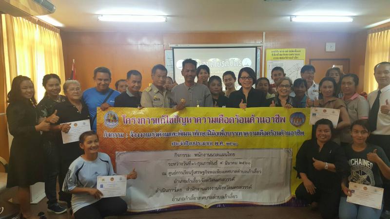 เมื่อวันที่ 3 มีนาคม 2560 นางพัฒนา พันธุฟัก แรงงานจังหวัดนครสวรรค์ เป็นประธานพิธีมอบวุฒิบัตร แก่ผู่ผ่านการฝึกอบรมพัฒนาทักษะฝีมือ ภายใต้โครงการแก้ไขปัญหาความเดือดร้อนด้านอาชีพ ประจำปีงบประมาณ พ.ศ. 2560 หลักสูตรพนักงานนวดแผนไทย มีผู้เข้าร่วมการอบรมจำนวน 16 คน ณ ห้องประชุมสำนักงานเทศบาลตำบลเก้าเลี้ยว อำเภอเก้าเลี้ยว จังหวัดนครสวรรค์ โดยได้รับเกียรติจาก นายนวพล นวกุลพันธ์ ปลัดอำเภอหัวหน้ากลุ่มงานบริหารงานปกครอง รักษาการแทนนายอำเภอเก้าเลี้ยว นายอุกฤษฏ์ แก้วเกษ รองนายกเทศมนตรีตำบลเก้าเลี้ยว และนายประเสริฐ มิ่งเมือง ประธานสภาเทศบาลตำบลเก้าเลี้ยว ร่วมพิธี และเป็นสักขีพยานในครั้งนี้