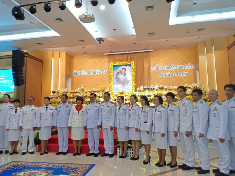 วันที่ 14 พฤศจิกายน 2561 เวลา 07.00 น. ณ ห้องประชุมใหญ่ ชั้น 5 เทศบาลนครนนทบุรี (อาคารใหม่) อำเภอเมืองนนทบุรี จังหวัดนนทบุรี : นางกัญจนาภรณ์ ไซกัล แรงงานจังหวัดนนทบุรี พร้อมกับหัวหน้าส่วนราชการในสังกัดกระทรวงแรงงาน และเจ้าหน้าที่สำนักงานแรงงานจังหวัดนนทบุรี เข้าร่วมงานพร้อมกับส่วนราชการในจังหวัดนนทบุรีในงาน “วันพระบิดาแห่งฝนหลวง” ประจำปี พ.ศ. 2561 ที่จัดขึ้นเพื่อถวายแด่พระบาทสมเด็จพระปรมินทรมหาภูมิพลอดุลยเดช บรมนาถบพิตร โดยมีนายภานุ แย้มศรี ผู้ว่าราชการจังหวัดนนทบุรี เป็นประธานงาน กิจกรรม ประกอบด้วย พิธีวางพานพุ่มดอกไม้สด การกล่าวคำถวายสักการะน้อมสำนึกในพระมหากรุณาธิคุณเบื้องหน้าพระบรมฉายาลักษณ์ และการจัดแสดงนิทรรศการโครงการพระราชดำริฝนหลวง เป็นต้น