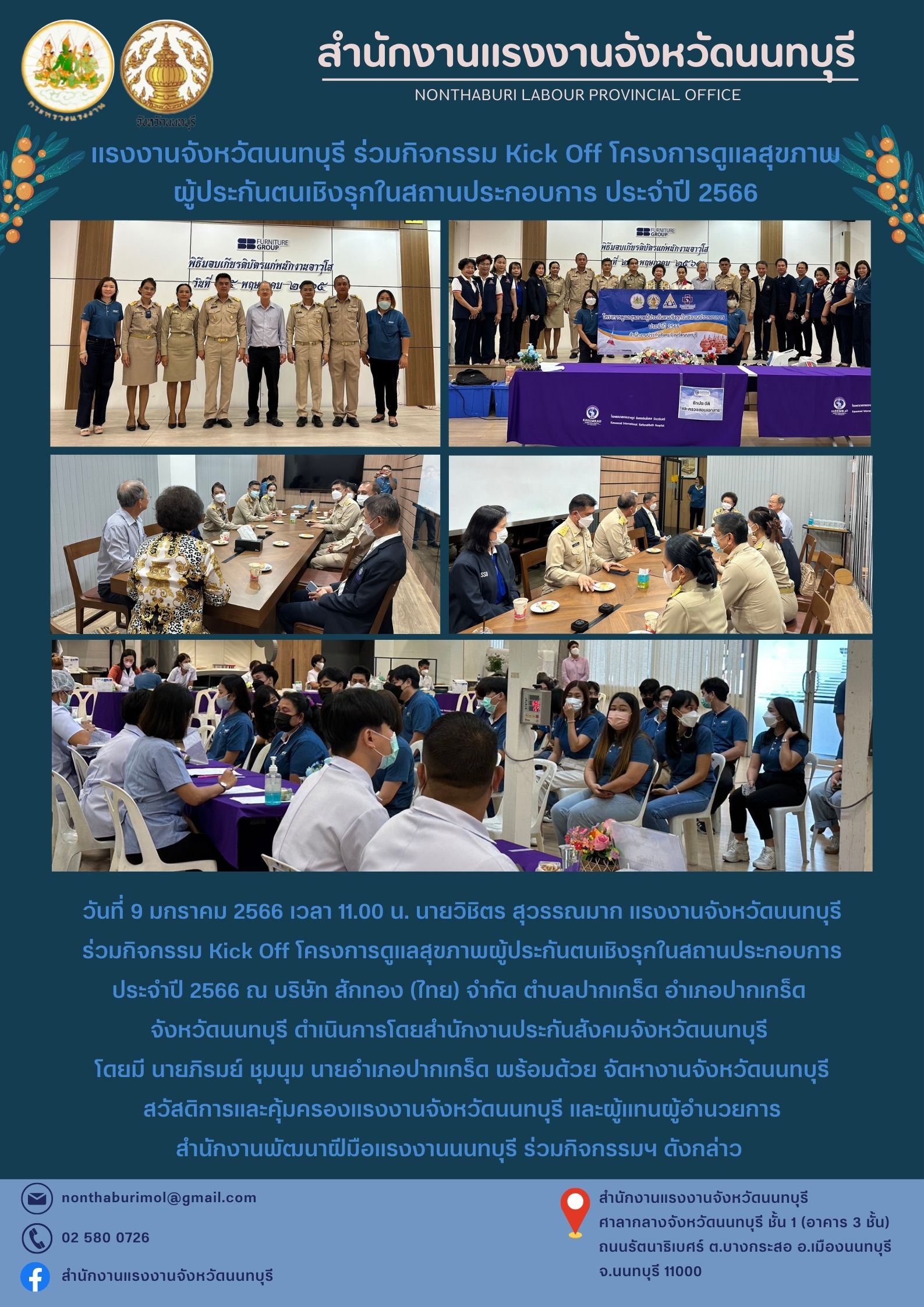 วันที่ 9 มกราคม 2566 เวลา 11.00 น. นายวิชิตร สุวรรณมาก แรงงานจังหวัดนนทบุรี ร่วมกิจกรรม Kick Off โครงการดูแลสุขภาพผู้ประกันตนเชิงรุกในสถานประกอบการประจำปี 2566 ณ บริษัท สักทอง (ไทย) จำกัด ตำบลปากเกร็ด อำเภอปากเกร็ด จังหวัดนนทบุรีดำเนินการโดยสำนักงานประกันสังคมจังหวัดนนทบุรี โดยมี นายภิรมย์ ชุมนุม นายอำเภอปากเกร็ด พร้อมด้วย จัดหางานจังหวัดนนทบุรี สวัสดิการและคุ้มครองแรงงานจังหวัดนนทบุรีและผู้แทนผู้อำนวยการ สำนักงานพัฒนาฝีมือแรงงานนนทบุรี ร่วมกิจกรรมฯ ดังกล่าว