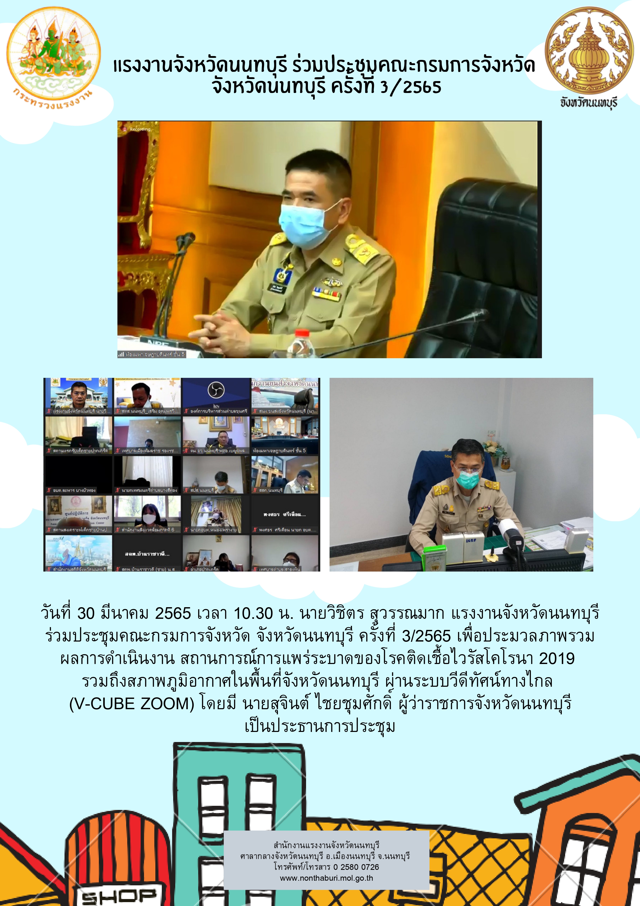 วันที่ 30 มีนาคม 2565 เวลา 10.30 น. นายวิชิตร สุวรรณมาก แรงงานจังหวัดนนทบุรี ร่วมประชุมคณะกรมการจังหวัด จังหวัดนนทบุรี ครั้งที่ 3/2565 เพื่อประมวลภาพรวมผลการดำเนินงาน สถานการณ์การแพร่ระบาดของโรคติดเชื้อไวรัสโคโรนา 2019 รวมถึงสภาพภูมิอากาศในพื้นที่จังหวัดนนทบุรี ผ่านระบบวีดีทัศน์ทางไกล (V-CUBE ZOOM) โดยมี นายสุจินต์ ไชยชุมศักดิ์ ผู้ว่าราชการจังหวัดนนทบุรีเป็นประธานการประชุม