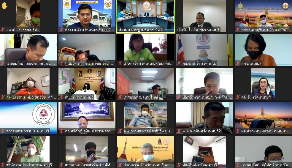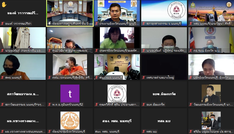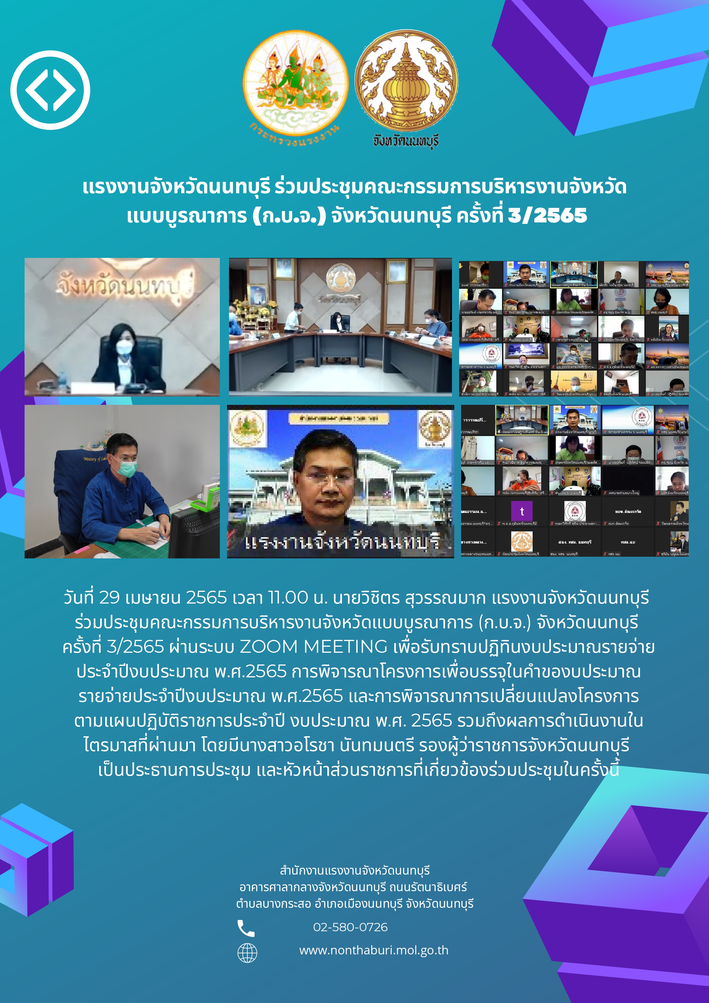 วันที่ 29 เมษายน 2565 เวลา 11.00 น. นายวิชิตร สุวรรณมาก แรงงานจังหวัดนนทบุรี ร่วมประชุมคณะกรรมการบริหารงานจังหวัดแบบบูรณาการ (ก.บ.จ.) จังหวัดนนทบุรี ครั้งที่ 3/2565 ผ่านระบบ ZOOM MEETING เพื่อรับทราบปฏิทินงบประมาณรายจ่ายประจำปีงบประมาณ พ.ศ.2565 การพิจารณาโครงการเพื่อบรรจุในคำของบประมาณรายจ่ายประจำปีงบประมาณ พ.ศ.2565 และการพิจารณาการเปลี่ยนแปลงโครงการตามแผนปฏิบัติราชการประจำปี งบประมาณ พ.ศ. 2565 รวมถึงผลการดำเนินงานในไตรมาสที่ผ่านมา โดยมีนางสาวอโรชา นันทมนตรี รองผู้ว่าราชการจังหวัดนนทบุรี เป็นประธานการประชุม และหัวหน้าส่วนราชการที่เกี่ยวข้องร่วมประชุมในครั้งนี้