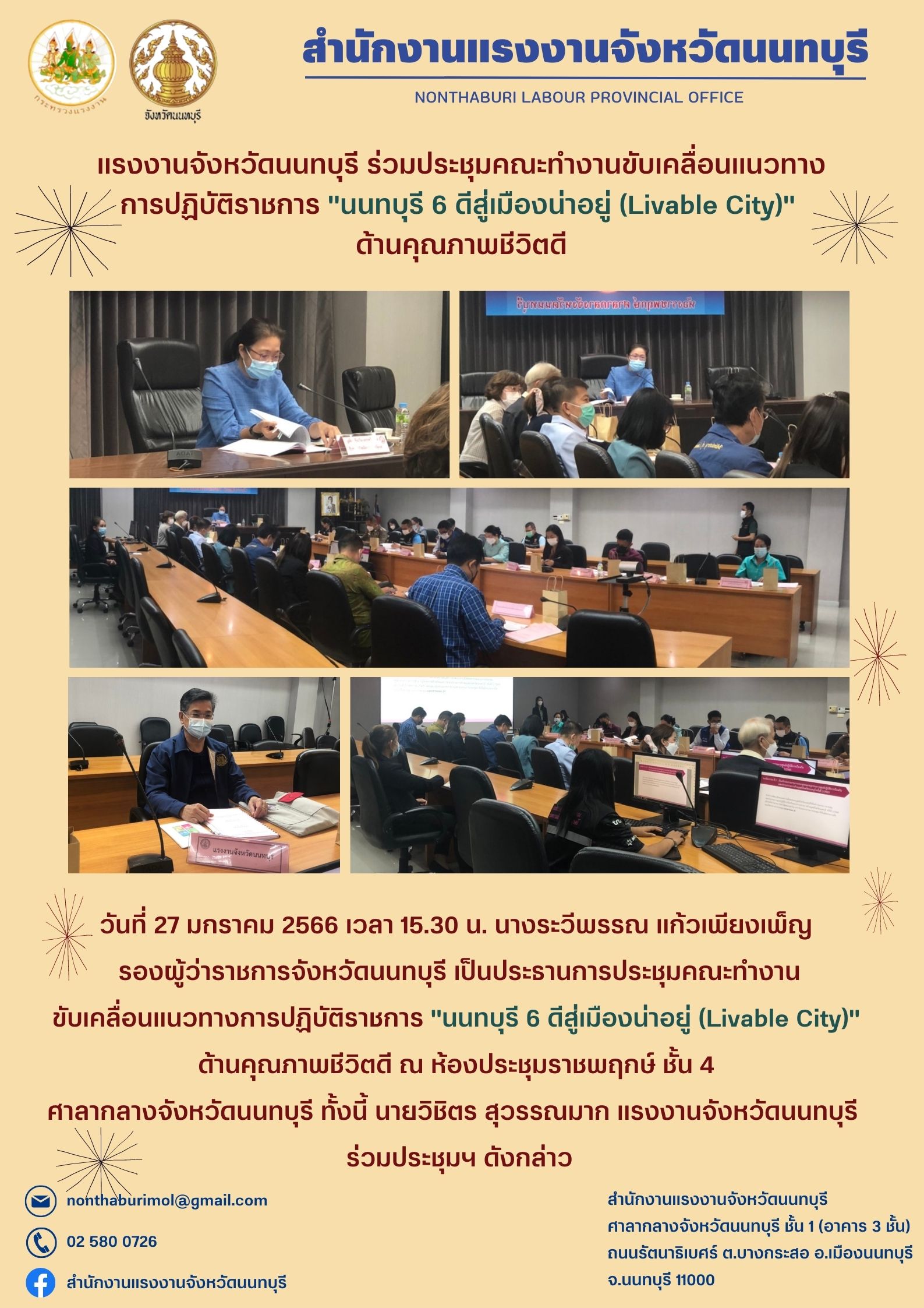 วันที่ 27 มกราคม 2566 เวลา 15.30 น. นางระวีพรรณ แก้วเพียงเพ็ญรองผู้ว่าราชการจังหวัดนนทบุรี เป็นประธานการประชุมคณะทำงานขับเคลื่อนแนวทางการปฏิบัติราชการ “นนทบุรี 6 ดีสู่เมืองน่าอยู่ (Livable City)”ด้านคุณภาพชีวิตดี ณ ห้องประชุมราชพฤกษ์ ชั้น 4ศาลากลางจังหวัดนนทบุรี ทั้งนี้ นายวิชิตร สุวรรณมาก แรงงานจังหวัดนนทบุรี ร่วมประชุมฯ ดังกล่าว