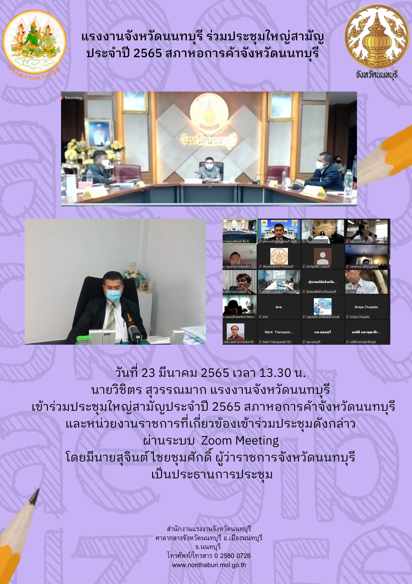 วันที่ 23 มีนาคม 2565 เวลา 13.30 น. นายวิชิตร สุวรรณมาก แรงงานจังหวัดนนทบุรี เข้าร่วมประชุมใหญ่สามัญประจำปี 2565 สภาหอการค้าจังหวัดนนทบุรี และหน่วยงานราชการที่เกี่ยวข้องเข้าร่วมประชุมดังกล่าว ผ่านระบบ Zoom Meeting โดยมีนายสุจินต์ ไชยชุมศักดิ์ ผู้ว่าราชการจังหวัดนนทบุรี เป็นประธานการประชุม