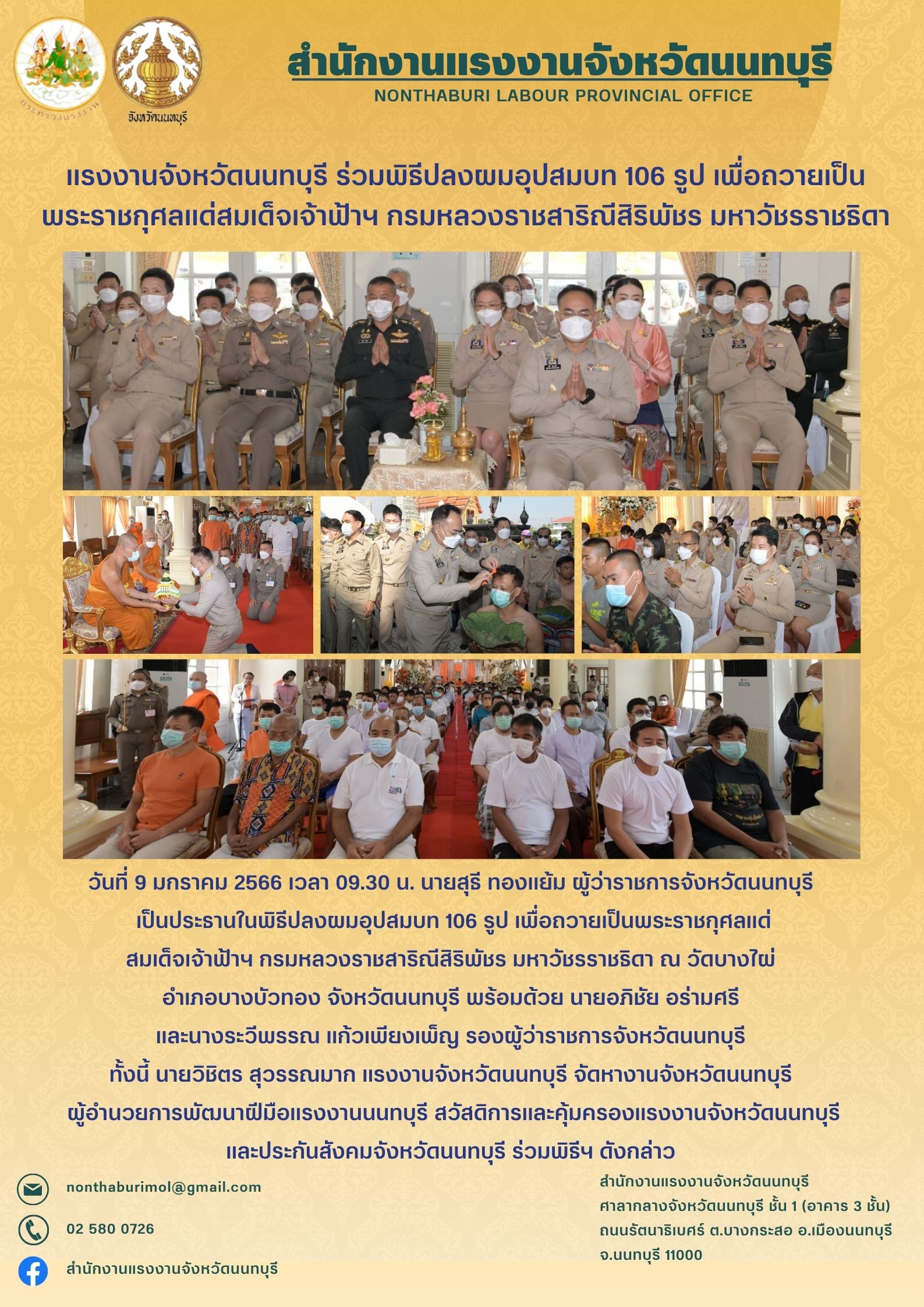 วันที่ 9 มกราคม 2566 เวลา 09.30 น. นายสุธี ทองแย้ม ผู้ว่าราชการจังหวัดนนทบุรี เป็นประธานในพิธีปลงผมอุปสมบท 106 รูป เพื่อถวายเป็นพระราชกุศลแด่สมเด็จเจ้าฟ้าฯ กรมหลวงราชสาริณีสิริพัชร มหาวัชรราชธิดา ณ วัดบางไผ่อำเภอบางบัวทอง จังหวัดนนทบุรี พร้อมด้วย นายอภิชัย อร่ามศรีและนางระวีพรรณ แก้วเพียงเพ็ญ รองผู้ว่าราชการจังหวัดนนทบุรีทั้งนี้ นายวิชิตร สุวรรณมาก แรงงานจังหวัดนนทบุรี จัดหางานจังหวัดนนทบุรีผู้อำนวยการสำนักงานพัฒนาฝีมือแรงงานนนทบุรี สวัสดิการและคุ้มครองแรงงานจังหวัดนนทบุรีและประกันสังคมจังหวัดนนทบุรี ร่วมพิธีฯ ดังกล่า