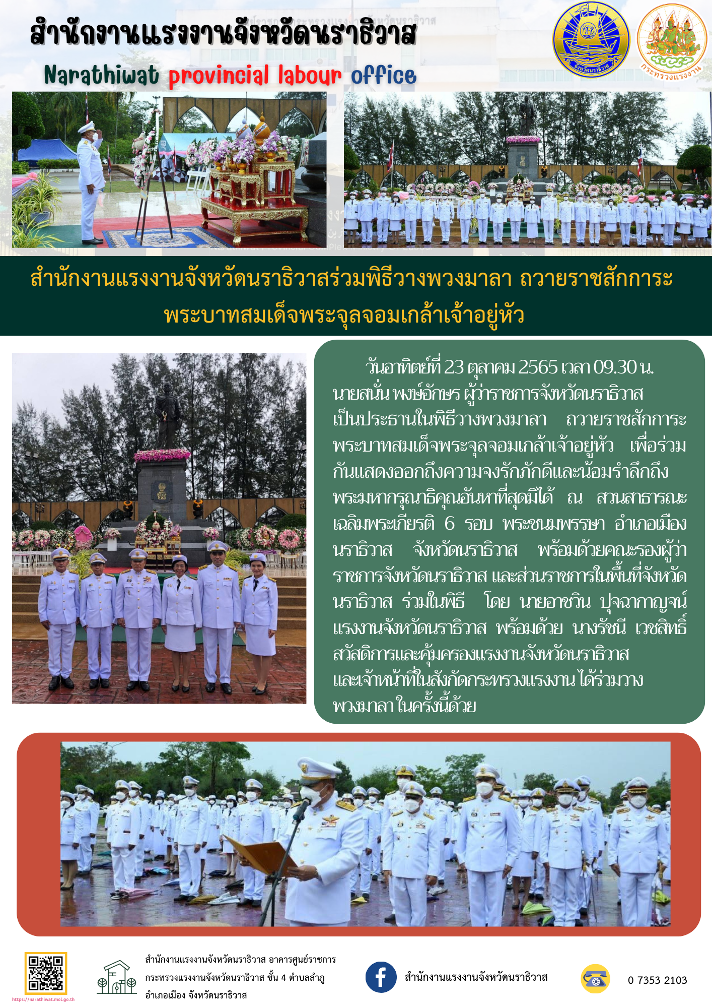 วันอาทิตย์ที่ 23 ตุลาคม 2565 เวลา 09.30 น. นายสนั่น พงษ์อักษร ผู้ว่าราชการจังหวัดนราธิวาส เป็นประธานในพิธีวางพวงมาลา ถวายราชสักการะ พระบาทสมเด็จพระจุลจอมเกล้าเจ้าอยู่หัว เพื่อร่วมกันแสดงออกถึงความจงรักภักดีและน้อมรำลึกถึงพระมหากรุณาธิคุณอันหาที่สุดมิได้ ณ สวนสาธารณะเฉลิมพระเกียรติ 6 รอบ พระชนมพรรษา อำเภอเมืองนราธิวาส จังหวัดนราธิวาส พร้อมด้วยคณะรองผู้ว่าราชการจังหวัดนราธิวาส และส่วนราชการในพื้นที่จังหวัดนราธิวาส ร่วมในพิธี โดย นายอาชวิน ปุจฉากาญจน์ แรงงานจังหวัดนราธิวาส พร้อมด้วย นางรัชนี เวชสิทธิ์ สวัสดิการและคุ้มครองแรงงานจังหวัดนราธิวาส และเจ้าหน้าที่ในสังกัดกระทรวงแรงงาน ได้ร่วมวางพวงมาลา ในครั้งนี้ด้วย