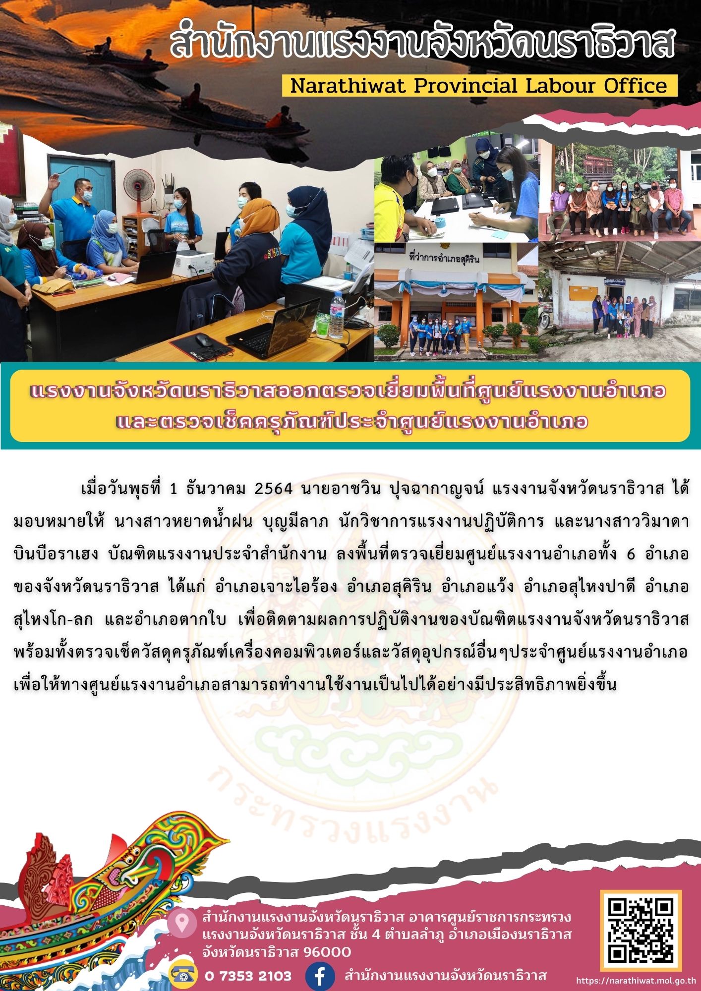 เมื่อวันพุธที่ 1 ธันวาคม 2564 นายอาชวิน ปุจฉากาญจน์ แรงงานจังหวัดนราธิวาส ได้มอบหมายให้ นางสาวหยาดน้ำฝน บุญมีลาภ นักวิชาการแรงงานปฏิบัติการ และนางสาววิมาดา บินบือราเฮง บัณฑิตแรงงานประจำสำนักงาน ลงพื้นที่ตรวจเยี่ยมศูนย์แรงงานอำเภอทั้ง 6 อำเภอของจังหวัดนราธิวาส ได้แก่ อำเภอเจาะไอร้อง อำเภอสุคิริน อำเภอแว้ง อำเภอสุไหงปาดี อำเภอ สุไหงโก-ลก และอำเภอตากใบ เพื่อติดตามผลการปฏิบัติงานของบัณฑิตแรงงานจังหวัดนราธิวาส พร้อมทั้งตรวจเช็ควัสดุครุภัณฑ์เครื่องคอมพิวเตอร์และวัสดุอุปกรณ์อื่นๆประจำศูนย์แรงงานอำเภอ เพื่อให้ทางศูนย์แรงงานอำเภอสามารถทำงานใช้งานเป็นไปได้อย่างมีประสิทธิภาพยิ่งขึ้น