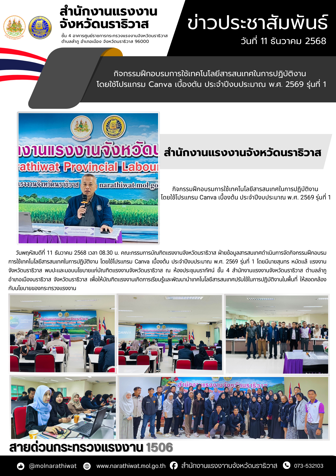 วันพฤหัสบดีที่ 11 ธันวาคม 2568 เวลา 08.30 น. คณะกรรมการบัณฑิตแรงงานจังหวัดนราธิวาส ฝ่ายข้อมูลสารสนเทศดำเนินการจัดกิจกรรมฝึกอบรมการใช้เทคโนโลยีสารสนเทศในการปฏิบัติงาน โดยใช้โปรแกรม Canva เบื้องต้น ประจำปีงบประมาณ พ.ศ. 2569 รุ่นที่ 1 โดยมีนายสุนทร หมัดแล้ แรงงานจังหวัดนราธิวาส พบปะและมอบนโยบายแก่บัณฑิตแรงงานจังหวัดนราธิวาส ณ ห้องประชุมนราทัศน์ ชั้น 4 สำนักงานแรงงานจังหวัดนราธิวาส ตำบลลำภู อำเภอเมืองนราธิวาส จังหวัดนราธิวาส เพื่อให้บัณฑิตแรงงานเกิดการเรียนรู้และพัฒนานำเทคโนโลยีสารสนเทศปรับใช้ในการปฏิบัติงานในพื้นที่ ให้สอดคล้องกับนโยบายของกระทรวงแรงงาน