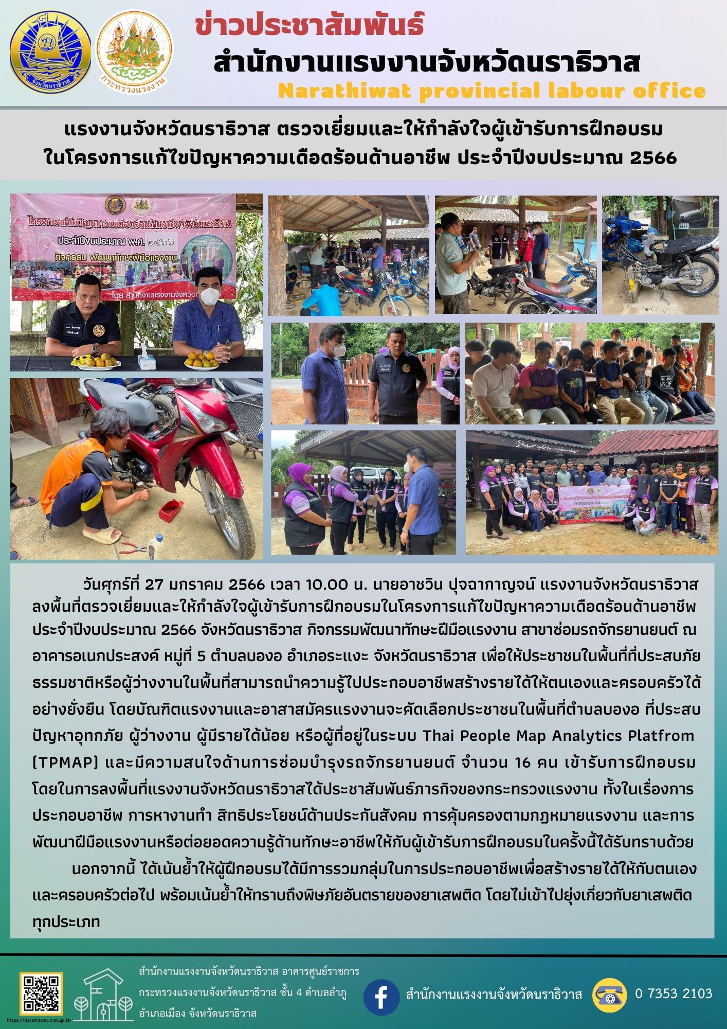 วันศุกร์ที่ 27 มกราคม 2566 เวลา 10.00 น. นายอาชวิน ปุจฉากาญจน์ แรงงานจังหวัดนราธิวาส ลงพื้นที่ตรวจเยี่ยมและให้กำลังใจผู้เข้ารับการฝึกอบรมในโครงการแก้ไขปัญหาความเดือดร้อนด้านอาชีพ ประจำปีงบประมาณ 2566 จังหวัดนราธิวาส กิจกรรมพัฒนาทักษะฝีมือแรงงาน สาขาซ่อมรถจักรยานยนต์ ณ อาคารอเนกประสงค์ หมู่ที่ 5 ตำบลบองอ อำเภอระแงะ จังหวัดนราธิวาส เพื่อให้ประชาชนในพื้นที่ที่ประสบภัย ธรรมชาติหรือผู้ว่างงานในพื้นที่สามารถนำความรู้ไปประกอบอาชีพสร้างรายได้ให้ตนเองและครอบครัวได้ อย่างยั่งยืน โดยบัณฑิตแรงงานและอาสาสมัครแรงงานจะคัดเลือกประชาชนในพื้นที่ตำบลบองอ ที่ประสบปัญหาอุทกภัย ผู้ว่างงาน ผู้มีรายได้น้อย หรือผู้ที่อยู่ในระบบ Thai People Map Analytics Platfrom (TPMAP) และมีความสนใจด้านการซ่อมบำรุงรถจักรยานยนต์ จำนวน 16 คน เข้ารับการฝึกอบรม โดยในการลงพื้นที่แรงงานจังหวัดนราธิวาสได้ประชาสัมพันธ์ภารกิจของกระทรวงแรงงาน ทั้งในเรื่องการประกอบอาชีพ การหางานทำ สิทธิประโยชน์ด้านประกันสังคม การคุ้มครองตามกฎหมายแรงงาน และการพัฒนาฝีมือแรงงานหรือต่อยอดความรู้ด้านทักษะอาชีพให้กับผู้เข้ารับการฝึกอบรมในครั้งนี้ได้รับทราบด้วย