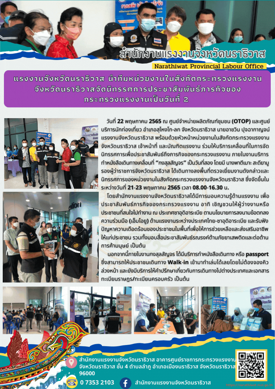 วันที่ 22 พฤษภาคม 2565 ณ ศูนย์จำหน่ายผลิตภัณฑ์ชุมชน (OTOP) และศูนย์บริการนักท่องเที่ยว อำเภอสุไหงโก-ลก จังหวัดนราธิวาส นายอาชวิน ปุจฉากาญจน์ แรงงานจังหวัดนราธิวาส พร้อมด้วยหัวหน้าหน่วยงานในสังกัดกระทรวงแรงงานจังหวัดนราธิวาส เจ้าหน้าที่ และบัณฑิตแรงงาน ร่วมให้บริการเคลื่อนที่ในการจัดนิทรรศการเพื่อประชาสัมพันธ์ถึงภารกิจของกระทรวงแรงงาน ภายในงานบริการทำหนังสือเดินทางเคลื่อนที่ “กงสุลสัญจร” เป็นวันที่สอง โดยมี นางพาตีเมาะ สะดียามู รองผู้ว่าราชการจังหวัดนราธิวาส ได้เดินทางลงพื้นที่ตรวจเยี่ยมงานดังกล่าวเเละนิทรรศการของหน่วยงานในสังกัดกระทรวงแรงงานจังหวัดนราธิวาส ซึ่งจัดขึ้นในระหว่างวันที่ 21-23 พฤษภาคม 2565 เวลา 08.00-16.30 น.
