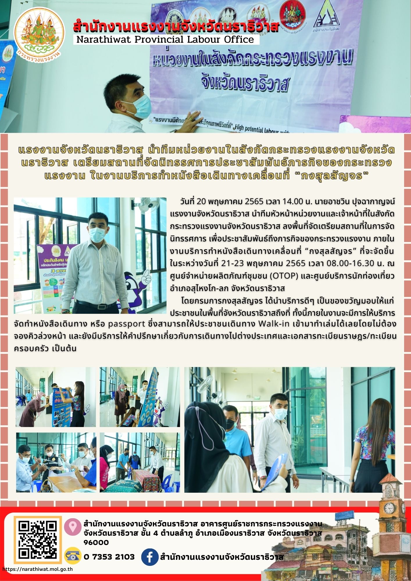 วันที่ 20 พฤษภาคม 2565 เวลา 14.00 น. นายอาชวิน ปุจฉากาญจน์ แรงงานจังหวัดนราธิวาส นำทีมหัวหน้าหน่วยงานและเจ้าหน้าที่ในสังกัดกระทรวงแรงงานจังหวัดนราธิวาส ลงพื้นที่จัดเตรียมสถานที่ในการจัดนิทรรศการ เพื่อประชาสัมพันธ์ถึงภารกิจของกระทรวงแรงงาน ภายในงานบริการทำหนังสือเดินทางเคลื่อนที่ “กงสุลสัญจร” ที่จะจัดขึ้นในระหว่างวันที่ 21-23 พฤษภาคม 2565 เวลา 08.00-16.30 น. ณ ศูนย์จำหน่ายผลิตภัณฑ์ชุมชน (OTOP) และศูนย์บริการนักท่องเที่ยว อำเภอสุไหงโก-ลก จังหวัดนราธิวาส