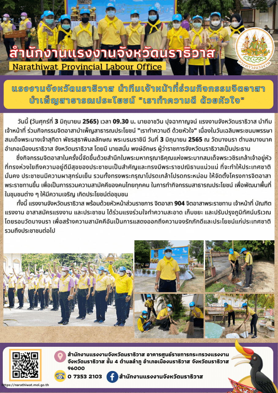 วันนี้ (วันศุกร์ที่ 3 มิถุนายน 2565) เวลา 09.30 น. นายอาชวิน ปุจฉากาญจน์ แรงงานจังหวัดนราธิวาส นำทีมเจ้าหน้าที่ ร่วมกิจกรรมจิตอาสาบำเพ็ญสาธารณประโยชน์ “เราทำความดี ด้วยหัวใจ” เนื่องในวันเฉลิมพระชนมพรรษาสมเด็จพระนางเจ้าสุทิดา พัชรสุธาพิมลลักษณ พระบรมราชินี วันที่ 3 มิถุนายน 2565 ณ วัดบางนรา ตำบลบางนาค อำเภอเมืองนราธิวาส จังหวัดนราธิวาส โดยมี นายสนั่น พงษ์อักษร ผู้ว่าราชการจังหวัดนราธิวาสเป็นประธาน