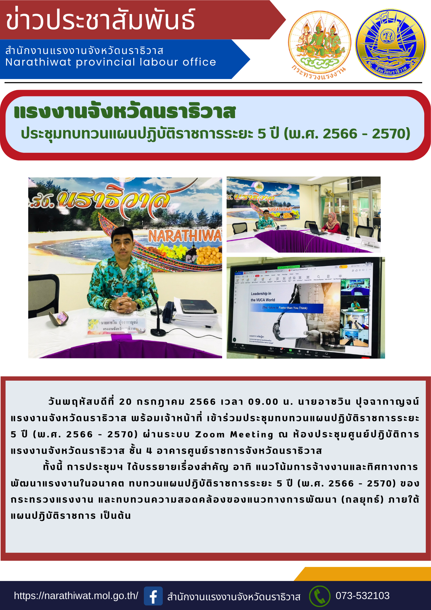 วันพฤหัสบดีที่ 20 กรกฎาคม 2566 เวลา 09.00 น. นายอาชวิน ปุจฉากาญจน์ แรงงานจังหวัดนราธิวาส พร้อมเจ้าหน้าที่ เข้าร่วมประชุมทบทวนแผนปฏิบัติราชการระยะ 5 ปี (พ.ศ. 2566 – 2570) ผ่านระบบ Zoom Meeting ณ ห้องประชุมศูนย์ปฎิบัติการแรงงานจังหวัดนราธิวาส ชั้น 4 อาคารศูนย์ราชการจังหวัดนราธิวาส ทั้งนี้ การประชุมฯ ได้บรรยายเรื่องสำคัญ อาทิ แนวโน้มการจ้างงานและทิศทางการพัฒนาแรงงานในอนาคต ทบทวนแผนปฎิบัติราชการระยะ 5 ปี (พ.ศ. 2566 – 2570) ของกระทรวงแรงงาน และทบทวนความสอดคล้องของแนวทางการพัฒนา (กลยุทธ์) ภายใต้แผนปฎิบัติราชการ เป็นต้น