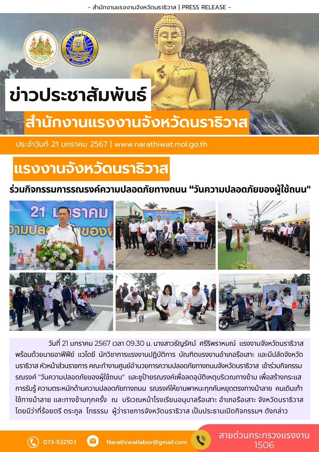 วันที่ 21 มกราคม 2567 เวลา 09.30 น. นางสาวธัญรัศม์ ศรีริพราหมณ์ แรงงานจังหวัดนราธิวาส พร้อมด้วยนายอาฟีฟีย์ แวโดยี นักวิชาการแรงงานปฏิบัติการ บัณฑิตแรงงานอำเภอรือเสาะ และมีปลัดจังหวัดนราธิวาส หัวหน้าส่วนราชการ คณะทำงานศูนย์อำนวยการความปลอดภัยทางถนนจังหวัดนราธิวาส เข้าร่วมกิจกรรมรณรงค์ “วันความปลอดภัยของผู้ใช้ถนน” และชูป้ายรณรงค์เพื่อลดอุบัติเหตุบริเวณทางข้าม เพื่อสร้างกระแสการรับรู้ ความตระหนักด้านความปลอดภัยทางถนน รณรงค์ให้ยานพาหนะทุกคันหยุดตรงทางม้าลาย คนเดินเท้าใช้ทางม้าลาย และทางข้ามทุกครั้ง ณ บริเวณหน้าโรงเรียนอนุบาลรือเสาะ อำเภอรือเสาะ จังหวัดนราธิวาส โดยมีว่าที่ร้อยตรี ตระกูล โทธรรม ผู้ว่าราชการจังหวัดนราธิวาส เป็นประธานเปิดกิจกรรมฯ ดังกล่าว