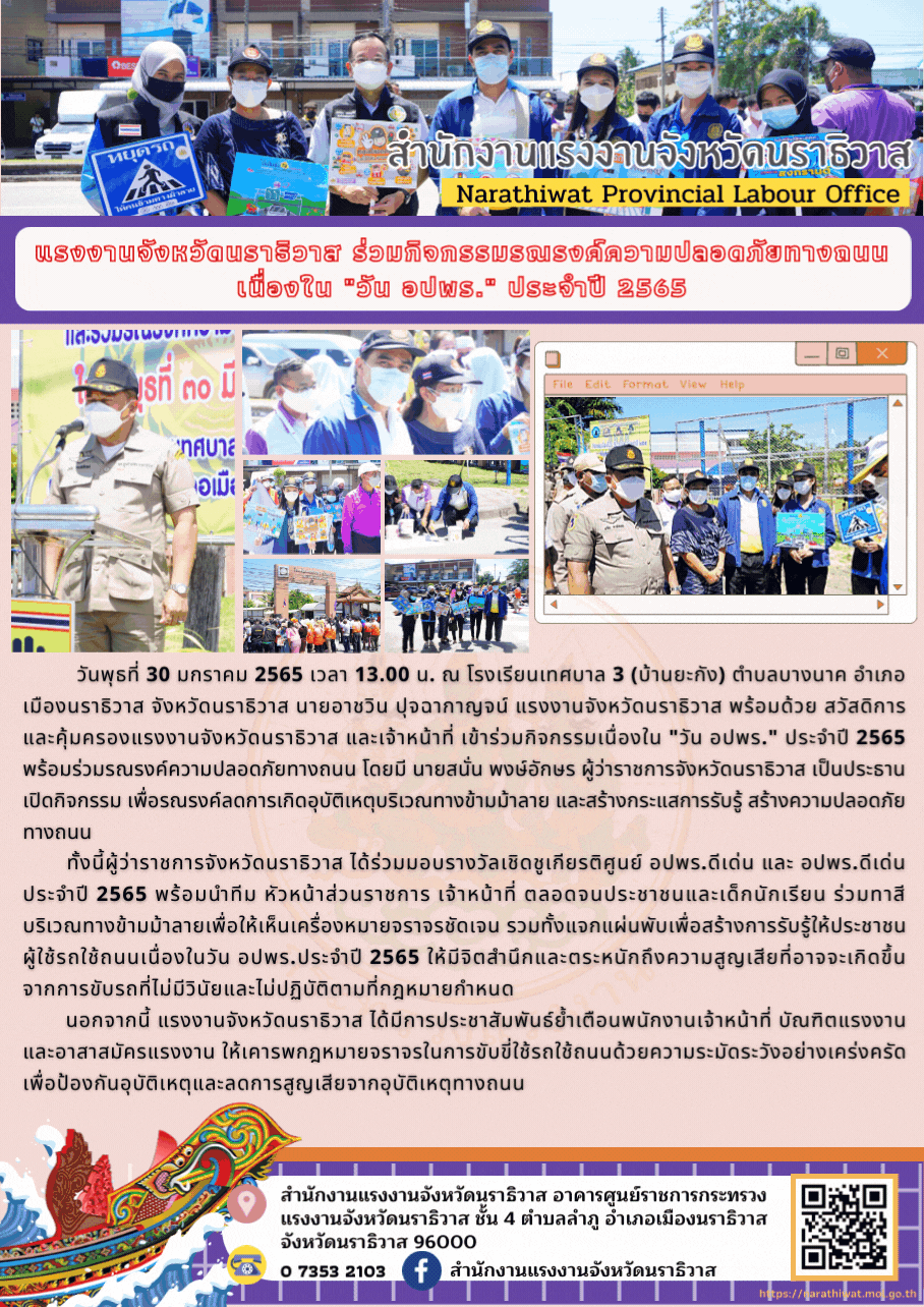 วันพุธที่ 30 มกราคม 2565 เวลา 13.00 น. ณ โรงเรียนเทศบาล 3 (บ้านยะกัง) ตำบลบางนาค อำเภอเมืองนราธิวาส จังหวัดนราธิวาส นายอาชวิน ปุจฉากาญจน์ แรงงานจังหวัดนราธิวาส พร้อมด้วย สวัสดิการและคุ้มครองแรงงานจังหวัดนราธิวาส และเจ้าหน้าที่ เข้าร่วมกิจกรรมเนื่องใน “วัน อปพร.” ประจำปี 2565 พร้อมร่วมรณรงค์ความปลอดภัยทางถนน โดยมี นายสนั่น พงษ์อักษร ผู้ว่าราชการจังหวัดนราธิวาส เป็นประธานเปิดกิจกรรม เพื่อรณรงค์ลดการเกิดอุบัติเหตุบริเวณทางข้ามม้าลาย และสร้างกระแสการรับรู้ สร้างความปลอดภัยทางถนน